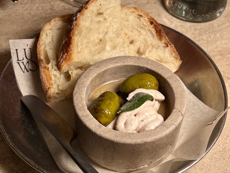 Хлеб в Luwo подают со взбитой рикоттой и оливками