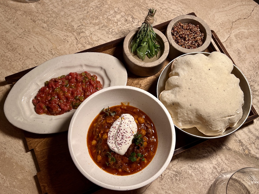 Также на столе вас будет ждать горячее из томленой лопатки козлёнка и нута, чуть островатое и требующее винной прохлады – зовите сомелье и требуйте рекомендаций или винную карту. Третьим блюдом на столе станет помолотый заатар с карамелизированным кунжутом. Его предлагают есть с питой, но, кажется, что хлеб был бы куда уместнее. Имейте в виду и просите корзинку с мягким белым хлебом.
