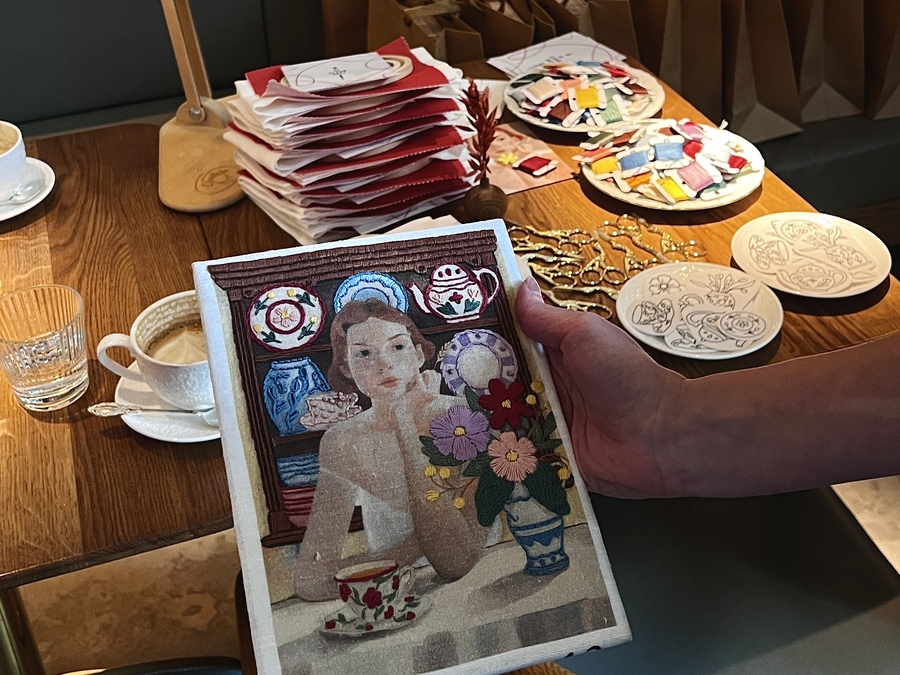 Под крафтовой упаковкой прячется готовая канва с изображением Ребекки – той самой часто фотографируемой картины со стены бистро. Кроме этого, в наборе деревянные пяльца, тренировочная канва, нити-мулине на бобинах (заботливо смотанные вручную владелицами бренда), подробная инструкция и доступ к видео-урокам. Посмотрев минутные обучающие ролики можно легко справиться с задачей и без страха отправиться в настоящую медитацию, следуя за иголкой и вдохновением.