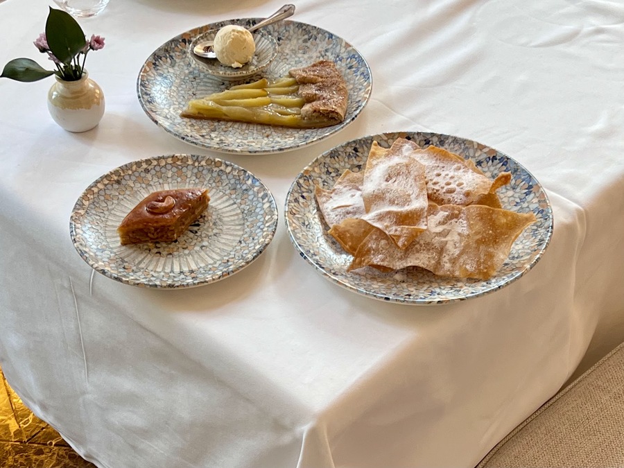 Голос соседних проектов обнаруживается в десертной карте. Её разработал шеф-кондитер Mr. Lee и Assunta Madre — Бек Караев. Рецепты отобрали из разных уголков света, не отказав гостям в европейской классике - профитролях и медовике, но и не позабыв зачем мы все здесь собрались, а именно, за восточными сладостями - пахлавой и лукумом. Но то, за чем действительно сюда стоит придти «на чай» - это огромные пироги-галеты, охраняющие правый угол бара. Напоминающие форму солнца, они могут также ярко подсветить и любой хмурый день гурмана. Непременно стоит просить отрезать кусочек того, что с грушей (1200₽) и подать его с шариком невесомого сорбета.
