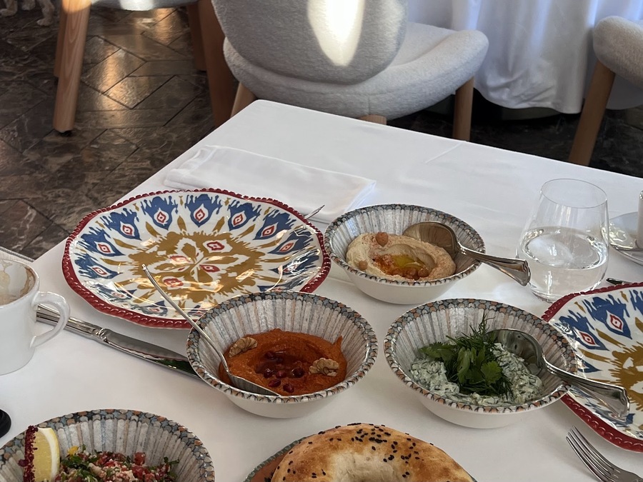 Говоря о Востоке, на голодный ум сразу приходят мезе и дипы. Здесь оказывается каноничным хумус (650₽), которому составляет компанию отличная лепешка из тандыра. Ешь и не хочется останавливаться!