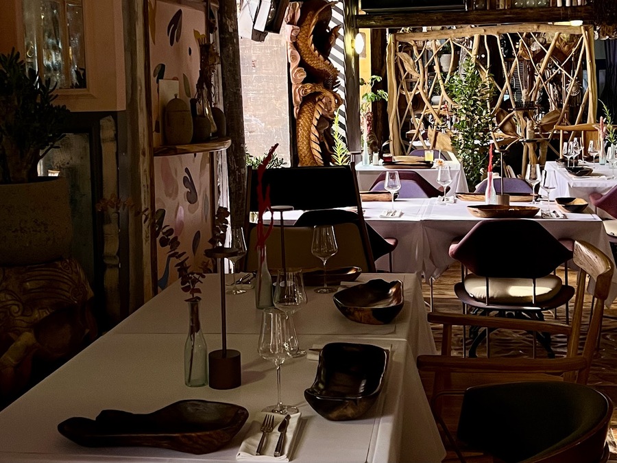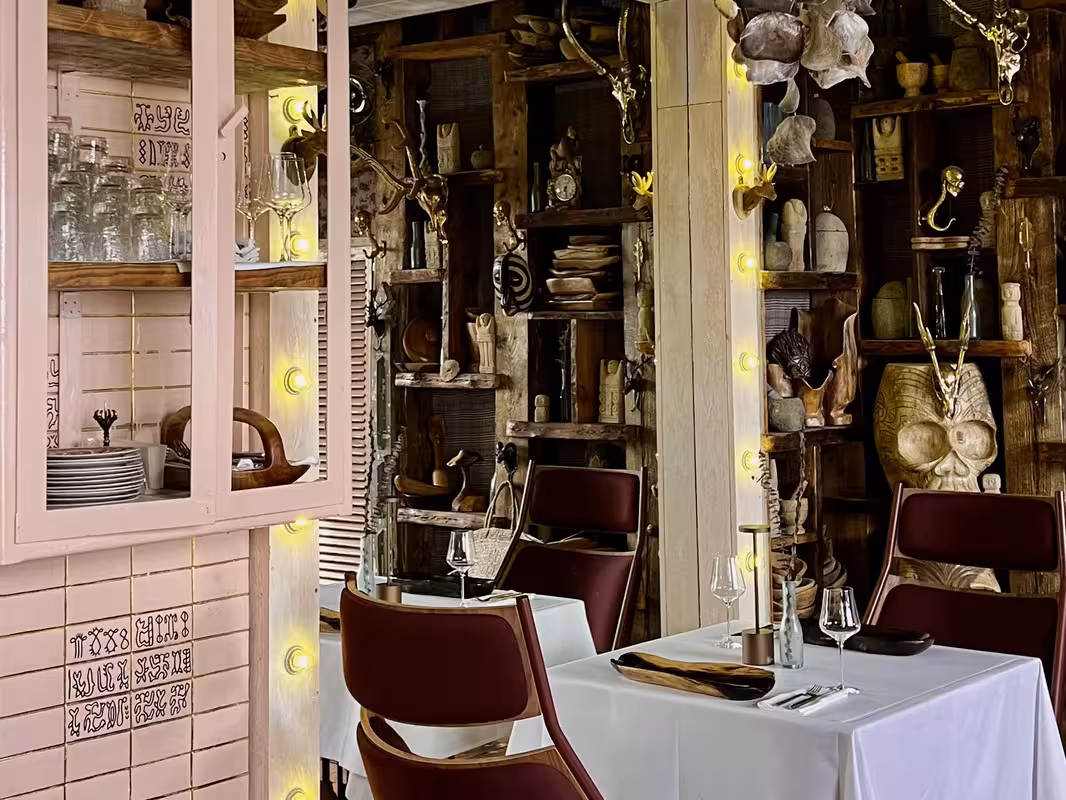 На первом этаже располагается основная зона с люстрами из раковин, диковинными статуэтками, яванским деревом и различными, наставленными по углам, диковинными штуками. Ощущение, что вот-вот начнется спиритический сеанс, может возникнуть спустя всего пару минут после того, как вы расположитесь за столиками. В целом, к Madame Roche стоит идти подготовленным,выспавшимся и готовым к разговорам, так как внимания всем гостям уделяют много (иногда даже слишком много). К столикам то и дело подходит улыбчивый персонал, чтобы отметить печатью на скатерти ваше присутствие, угостить дайджестивом, рассказать о традицияхдома (говорят, в 17:00 в доме принято пить чай) или предложить выбрать закуску на разогрев. Делает это «темнокожий кавалер» с большим деревянным подносом, с которого к вам и попадает мини-пиала со специалитетами за скромные 300 рублей (раздел «закуски»).