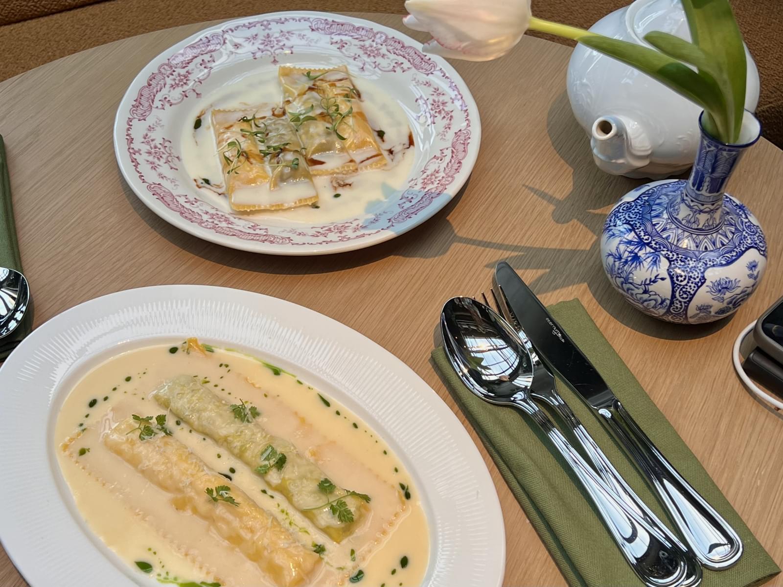 Равиоли с гребешком, черной треской и рикоттой (920₽), равиоли доппио с томленой щекой и полётной (850₽)