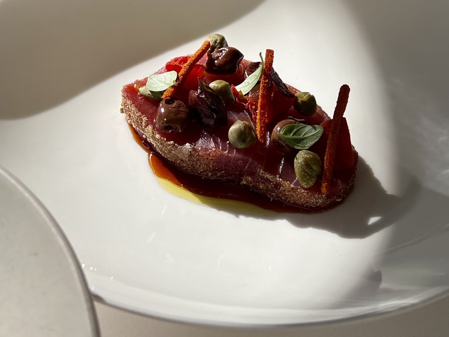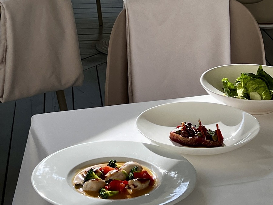 Оказавшись здесь за обедом, непременно стоит пробовать тунца (1900₽) в специях с каперсами и оливками. Добротный рыбный кусок прекрасно звучит в дуэте с зеленым салатом (900₽), который не претендует на «модный показ» и разглядывание гостей: под салатными листьями спрятаны авокадо, яблоко, кенийская фасоль, адамаме, заправленных медово-горчичным соусом. Всем, кто при упоминании кальмаров, сомнительно вздыхает и побаивается «гастрономического казино», точно стоит заказать бэби-кальмары (1700₽) с томатами, брокколи и соусом лече де тигре. Лече де тигре — это маринад, в состав которого входит сок лайма, сельдерей, имбирь, перец чили, лук, чеснок, кинза, кусочки рыбы, рыбный бульон. Единственным недостатком может оказаться как раз таки яркий вкус чеснока и зелени, однако, после бурной ночи именно они и способны освежить и воскресить.