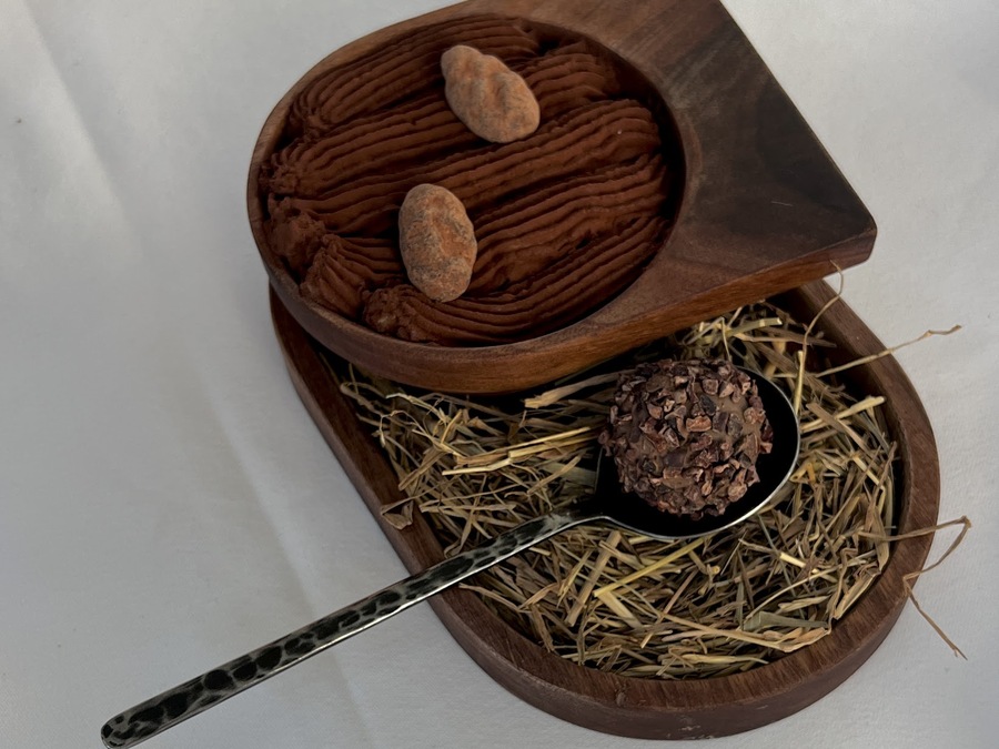 Никому в голову не придет отказываясь от десерта, заканчивая свой ужин. Для «прощаний» в ресторане имеются семь десертов, мороженое и сорбет. Названия, конечно же, тянут прибегнуть к разъяснению официантов. Десерт «бородинский хлеб» (1300₽) из хлебного содержит «мусс из ржаного хлеба» и дополняется мороженым из бер-нуазет и тмина, а «поле» (1500₽) прячет в себе савоярди из цельнозерново муки и сыр из кофейной свёклы (да, она здесь частая гостья!). В реалиях совместная жизнь этих ингредиентов тянет на тирамису, но чуть более воздушный, хотя крем нельзя назвать однородным и «сырным», от которого и дрожит рука любителя тирамису. Пробовать и развлекать рецепторы, однозначно, стоит, но о безупречности текстур можно поспорить. А что, вполне хорошая идея для незамысловатых (или первых) бесед.