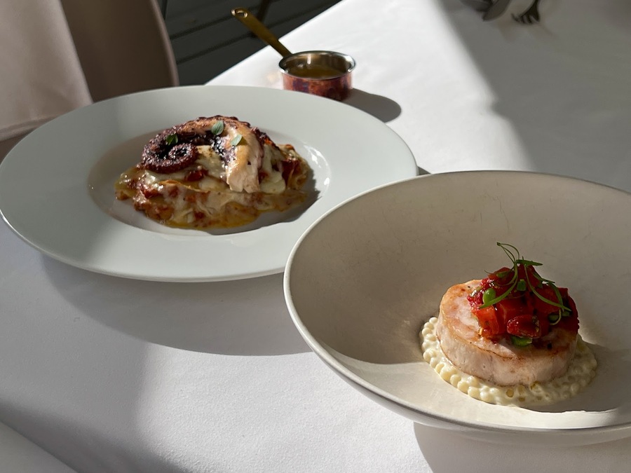 Продолжить знакомство с затейливыми блюдами стоит кроликом с птитимом (2500₽) или осьминогом с картофельной лазаньей (2800₽). И то, и то насытит и доставит удовольствие. В первом — превосходно приготовленное мясо, во втором — тонкие слайсы картофеля и много сыра, чуть жирновато, но затягивает неслабо. Осьминог же скорее играет роль визуального поощрителя, но до вкусового «топа» не дотягивает.