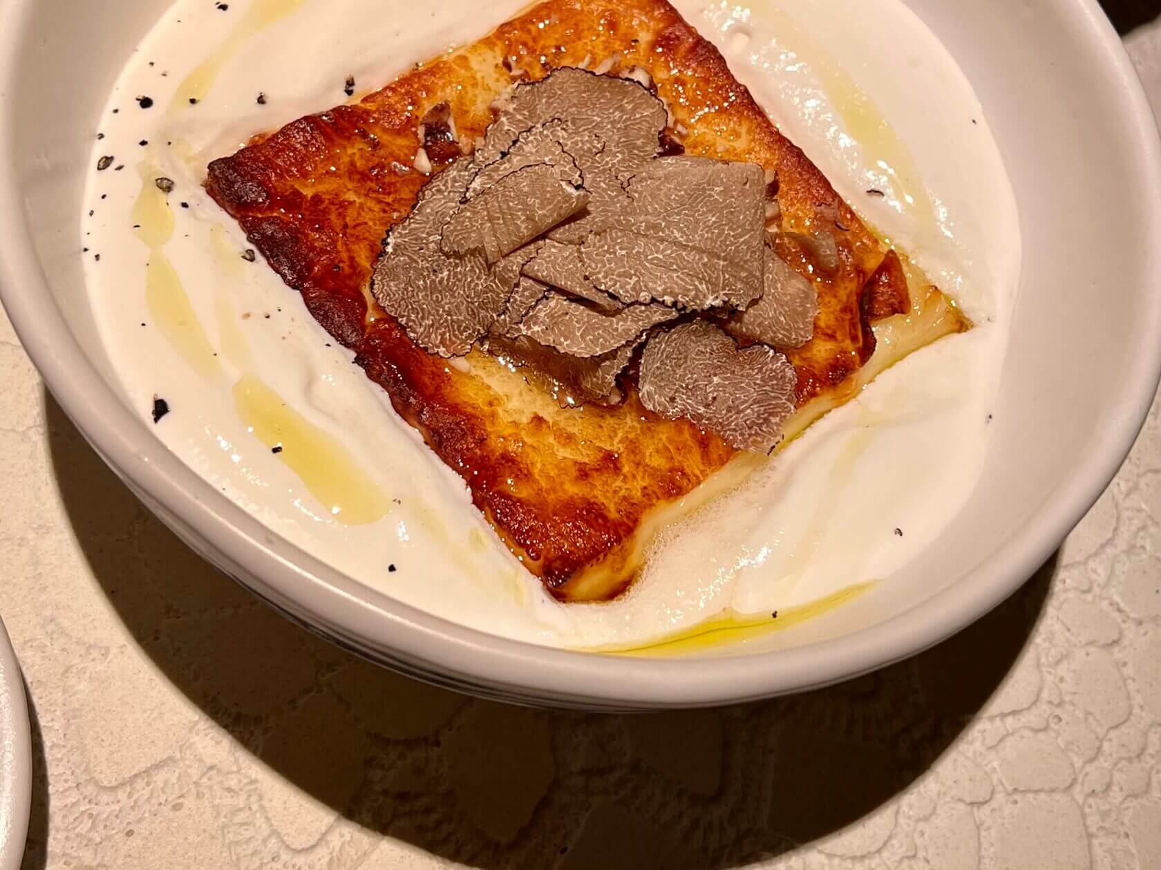 Халуми запекают с йогуртом и подают с мёдом и трюфелем (1100₽). Всем страстным любителям сыра посвящается.