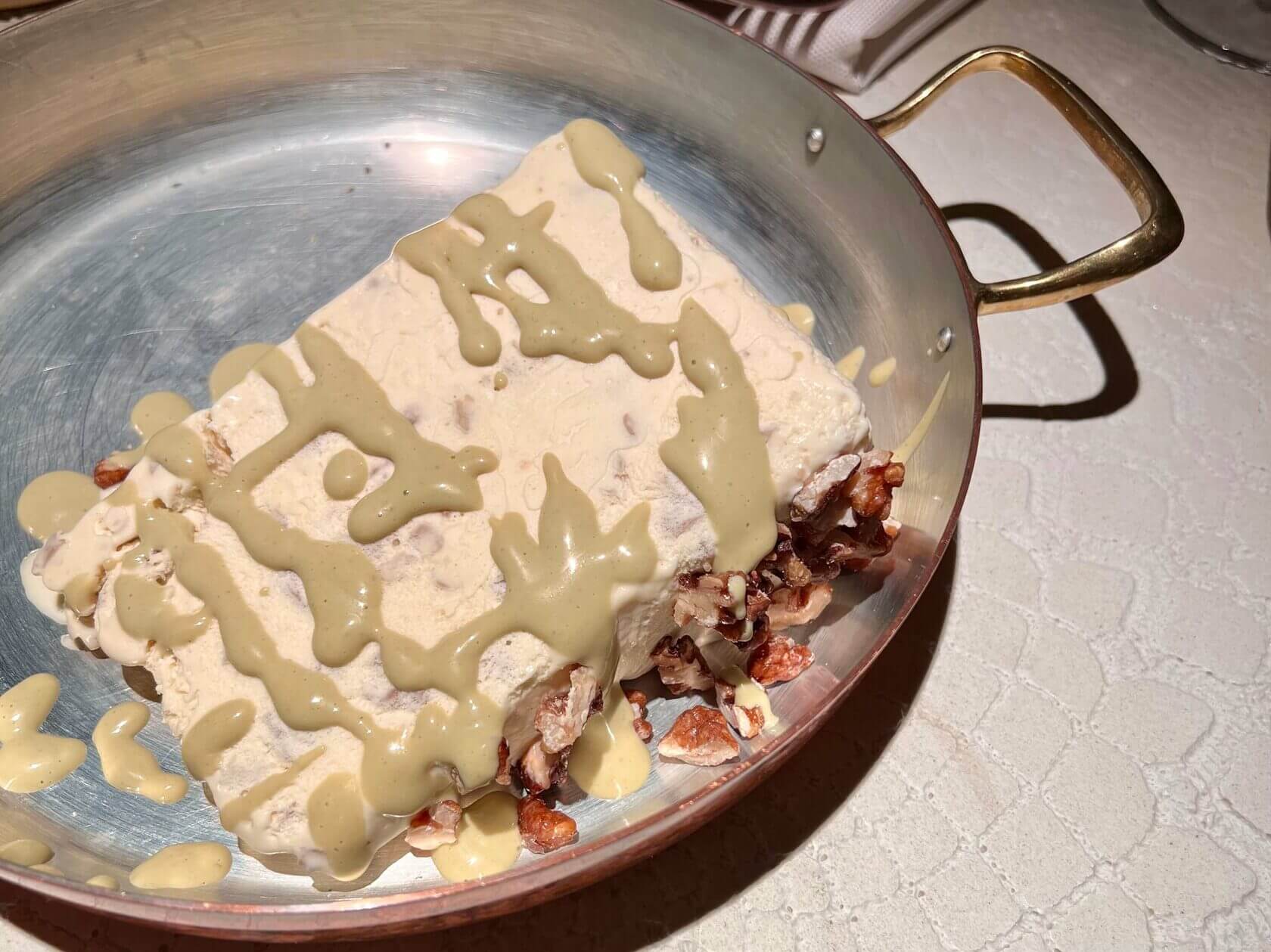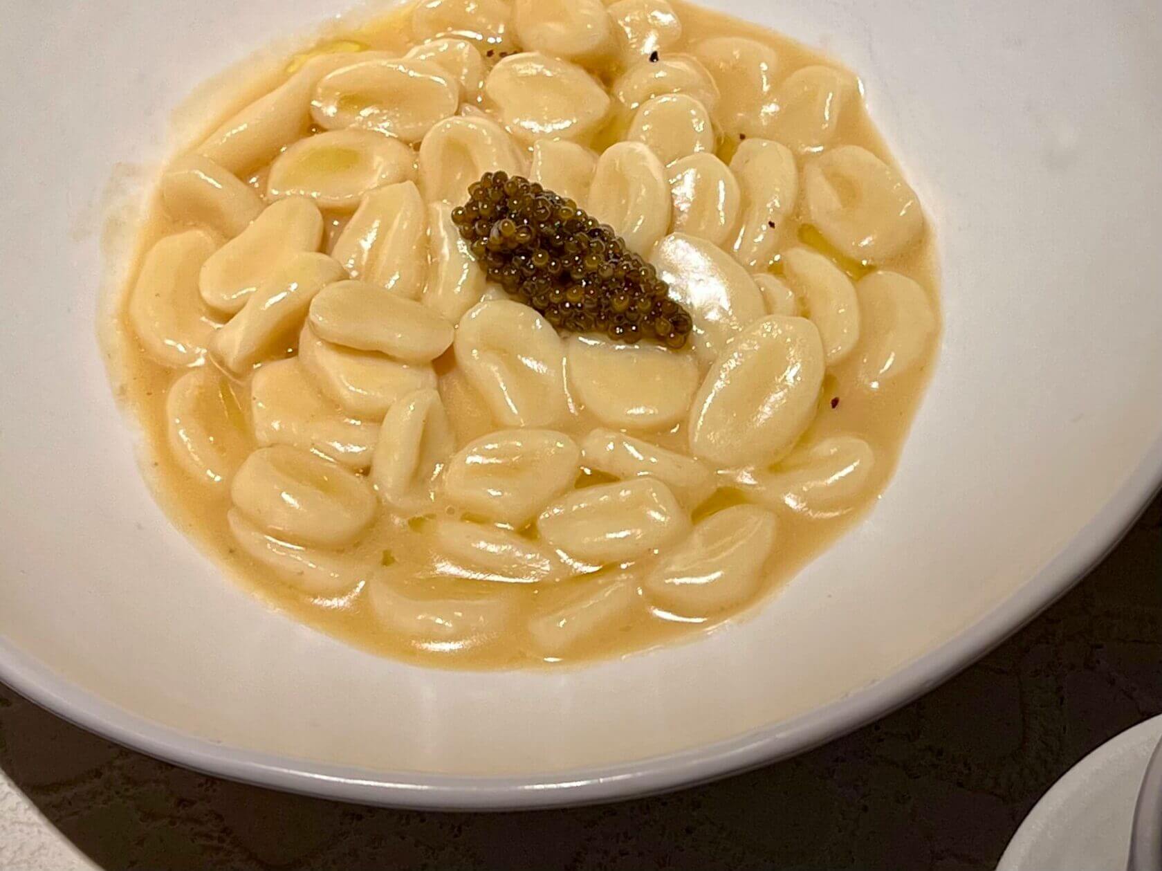 Ещё одной узнаваемой позицией, а заодно и триггером светской жизни, стали ньокки из брынзы с чёрной икрой (1650₽). Сыр ощущается на легком послевкусии, сами ньокки не тугие, с первоклассными ямочками, на которые хорошо цепляется соус.