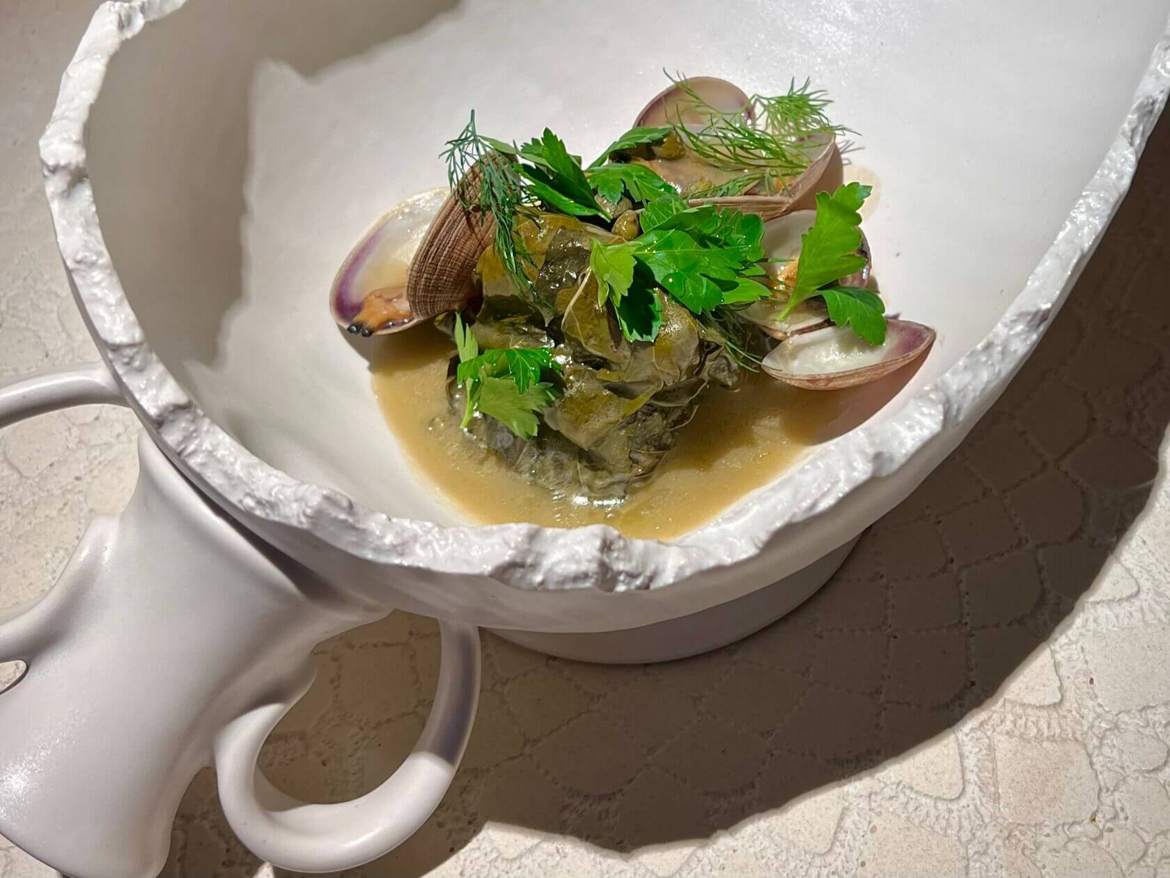 Эффектно подают долму — с начинкой из краба, креветок и дорадо в рыбном бульоне (1350₽). Готовится она в собственной печи и совершенно без соли. Гармоничное, сочное, впитавшее «море», блюдо.