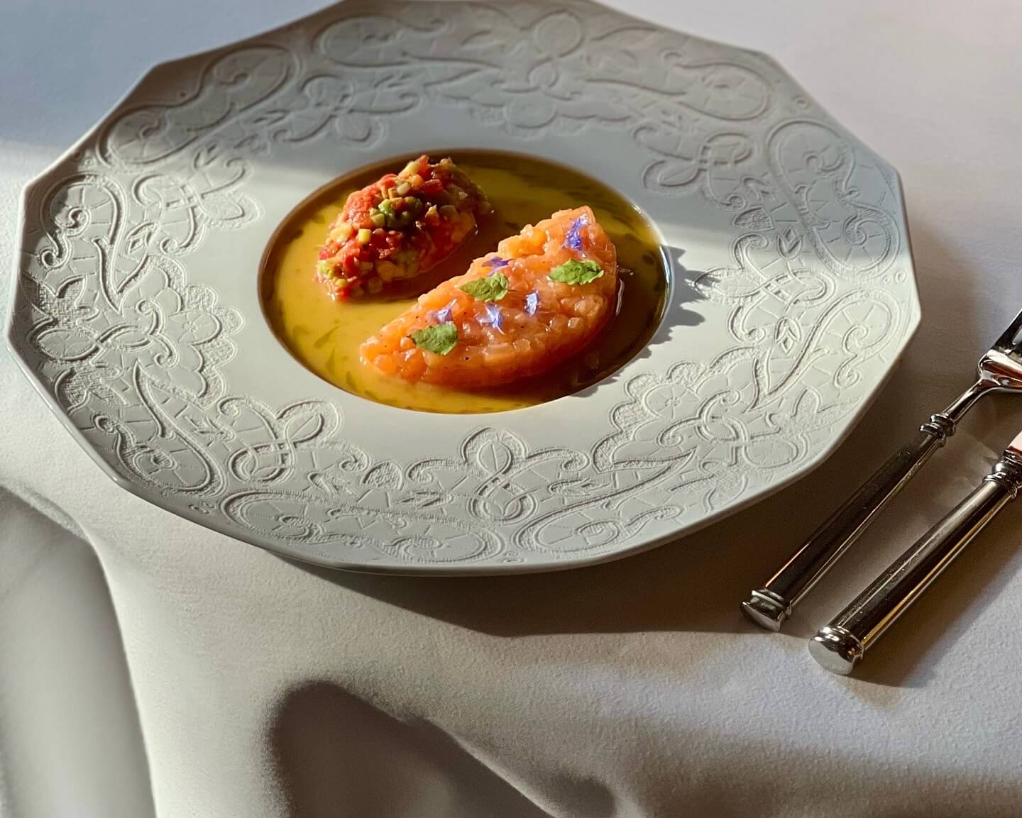Тартар из мурманского лосося с одной стороны и тартар из авокадо, сладких помидоров и приправ — с другой. Блюдо от шефа Эдуарда Архипова из ресторана Шануар