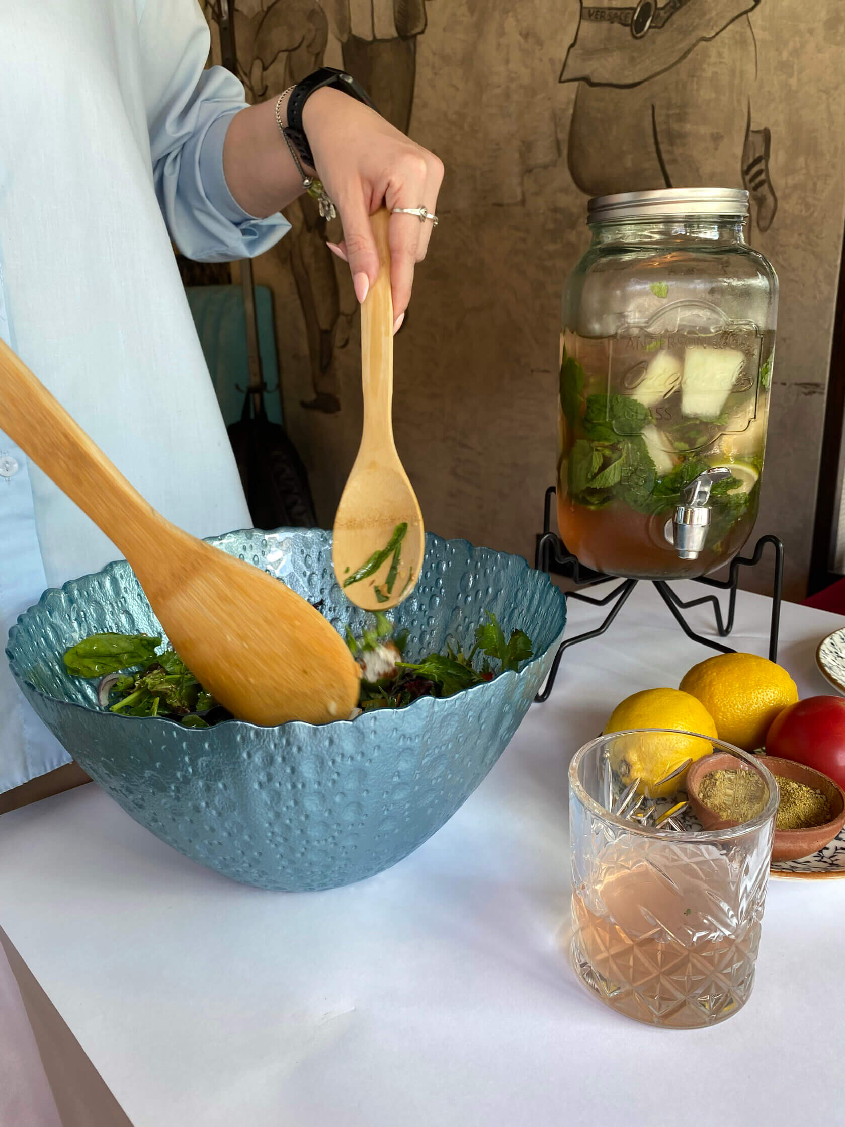 Зеленый салат с овощами, пастой птитим и лаймовой заправкой подают на стол в большой миске и начинают медленно перемешивать прямо перед вами. Огромное количество зелени и салата, цукини, болгарский перец, красный лук, творожный сыр и лаймовая заправка – идеальное блюдо в стол, еще и с insta-подачей.