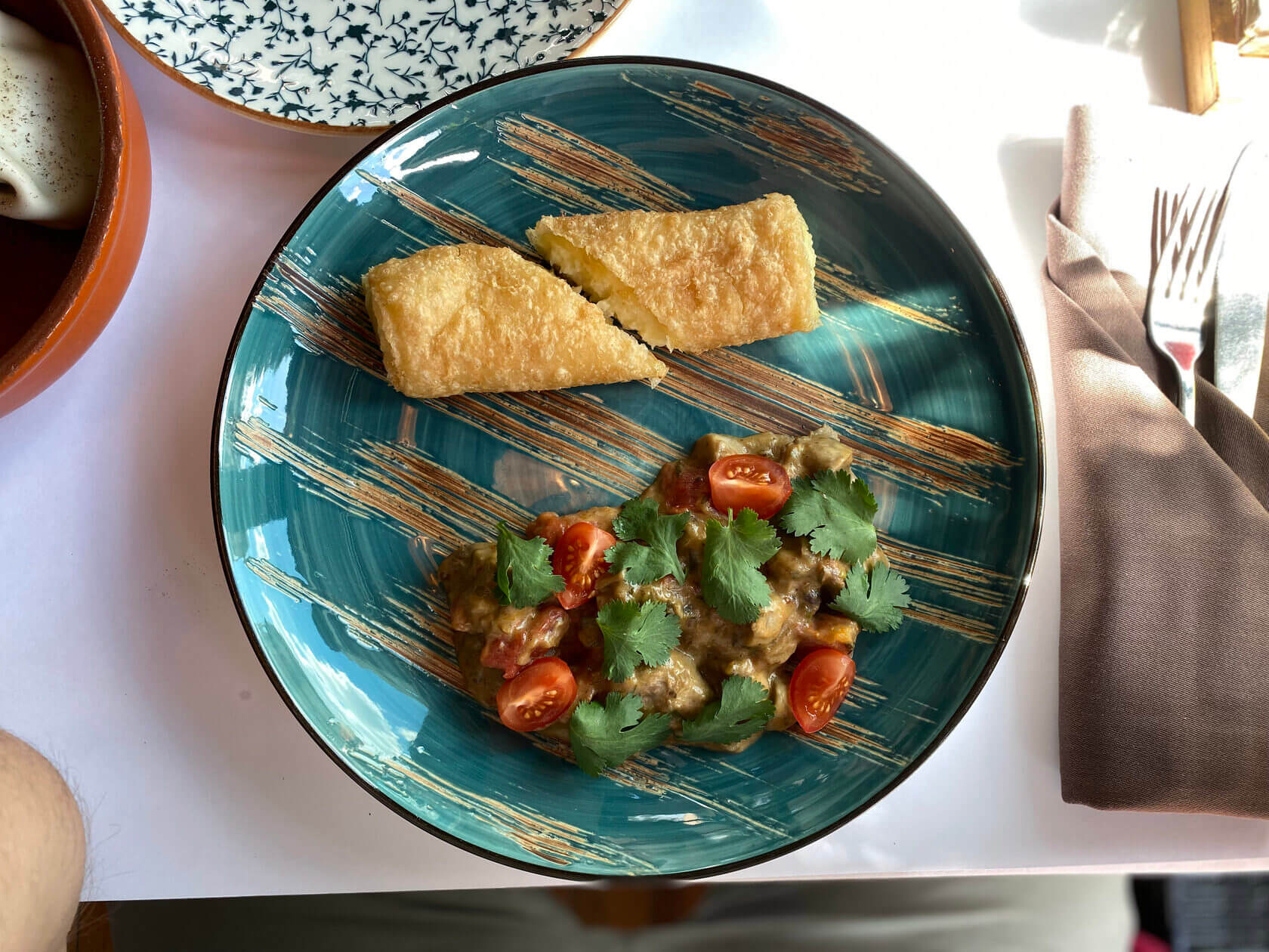 Баранина, томленая в сливочном соусе с грибами и свежим тархуном подается с интересным роллом из пшеничной муки с ташмиджаби (картофельное пюре с сыром сулугуни) на манер спринг-ролла. Мясо приготовлено так, что не сразу понимаешь, что перед вами баранина, а грузинский «спринг ролл» выглядит уместно и отлично дополняет мясо.