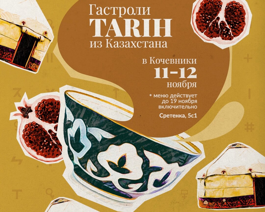 11 и 12 ноября с 14:30 — идём в Кочевники на знакомство с казахской кухней. Из Алматы приезжает бар Story и ресторан Tarih, чтобы познакомить москвичей с Казахстаном поближе: в меню традиционные иримшик, бешбармак, деликатесы — казы и жая, в коктейльной карте четыре напитка, посвящённые городам: «Алматы», «Апорта», «Актобе», «Костанай». Меню доступно после 16:00.