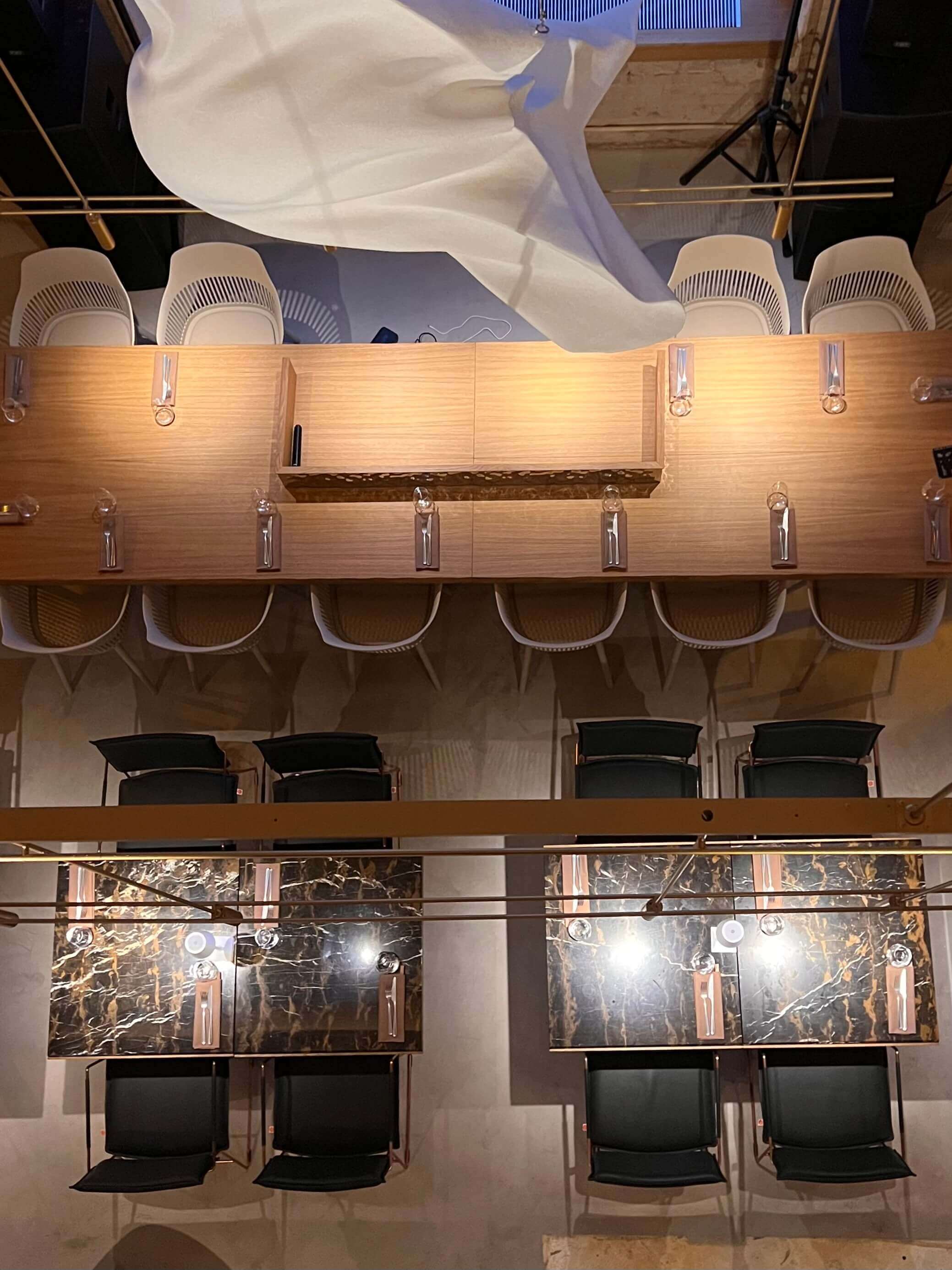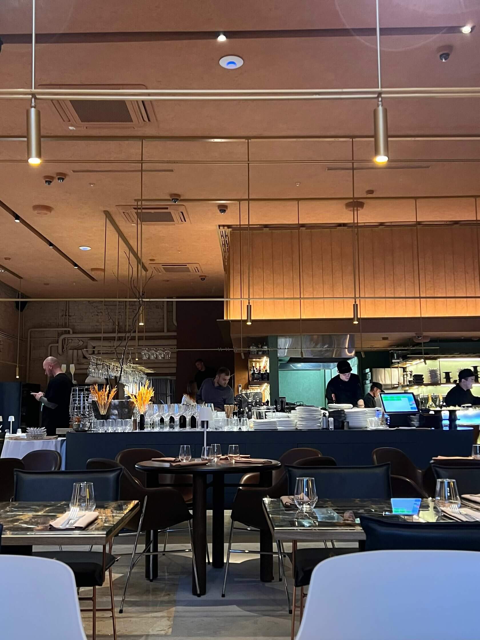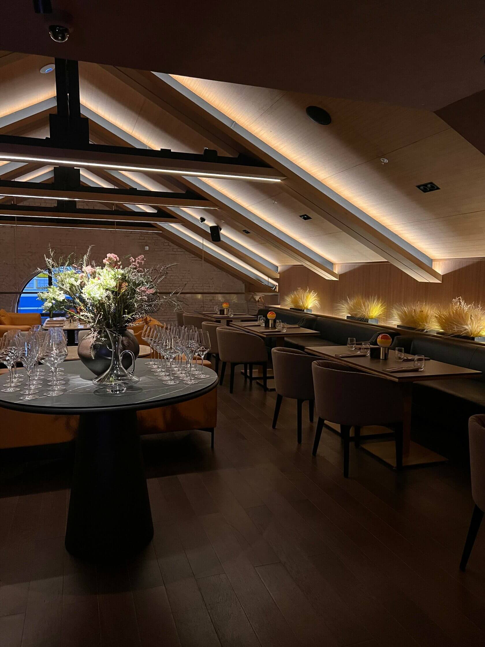 За внешнее сочетание металла и камня отвечало архитектурное бюро Archpoint. Тонкий интерьерный слог гармонично дополняют массивные светильники, напоминающие летящие паруса, а точёное стекло на каменных столешницах так и манит сказать «чин-чин» по поводу и без.
