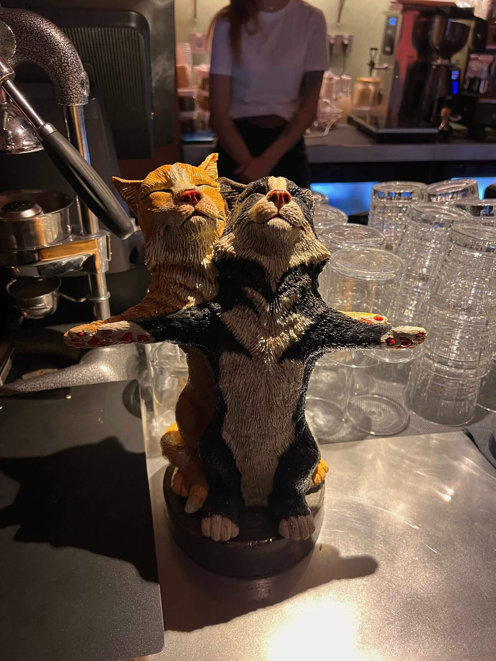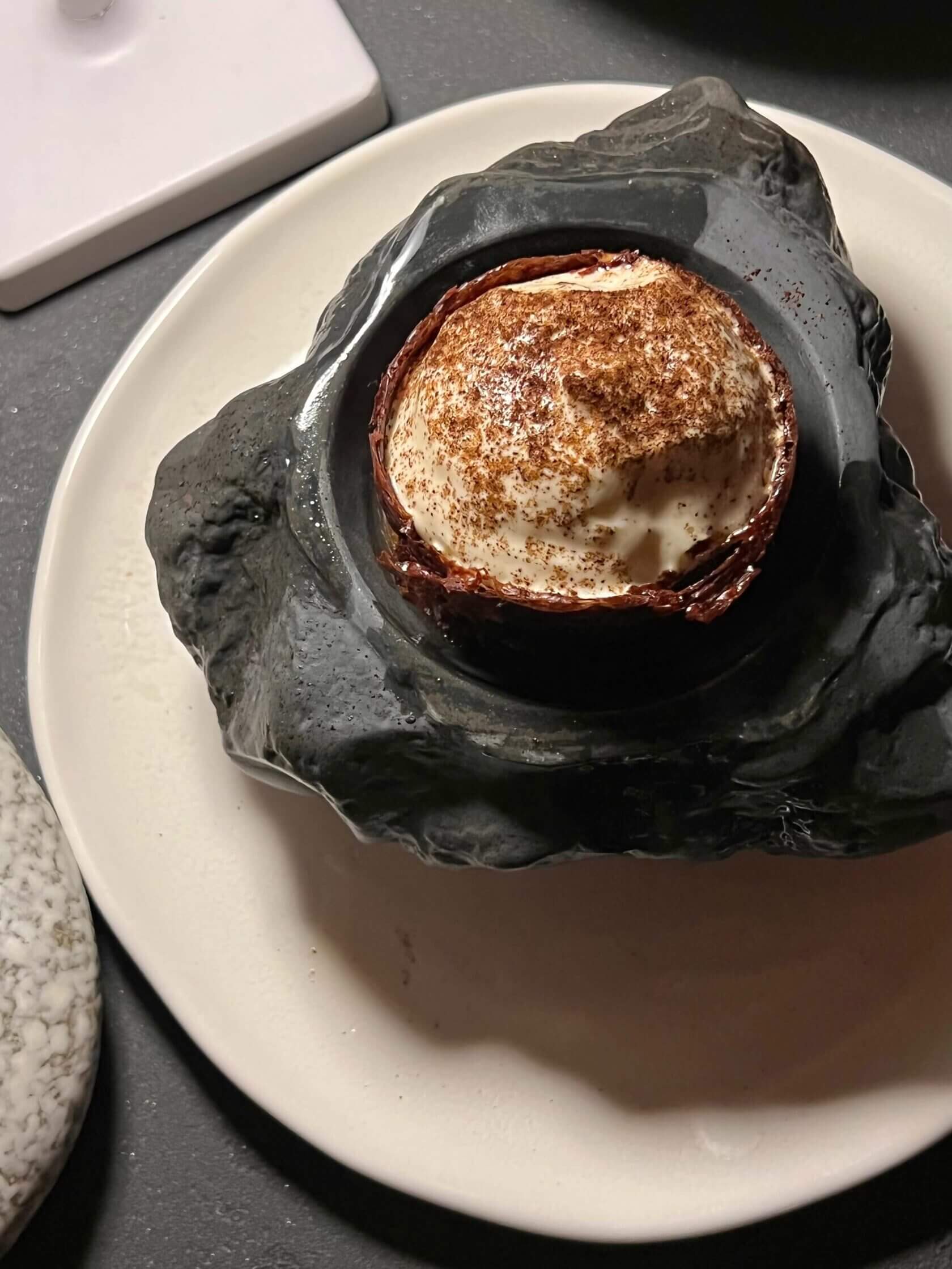 Креативить продолжили в десертах. Шоколадный крем с хрустящим штрейзелем подаётся в камне и поливается подожжённым виски (650₽). Кофеманам он покажется райским наслаждением за счёт отчётливого вкуса зёрен. Остальных, равнодушных, просим быть поосторожнее.