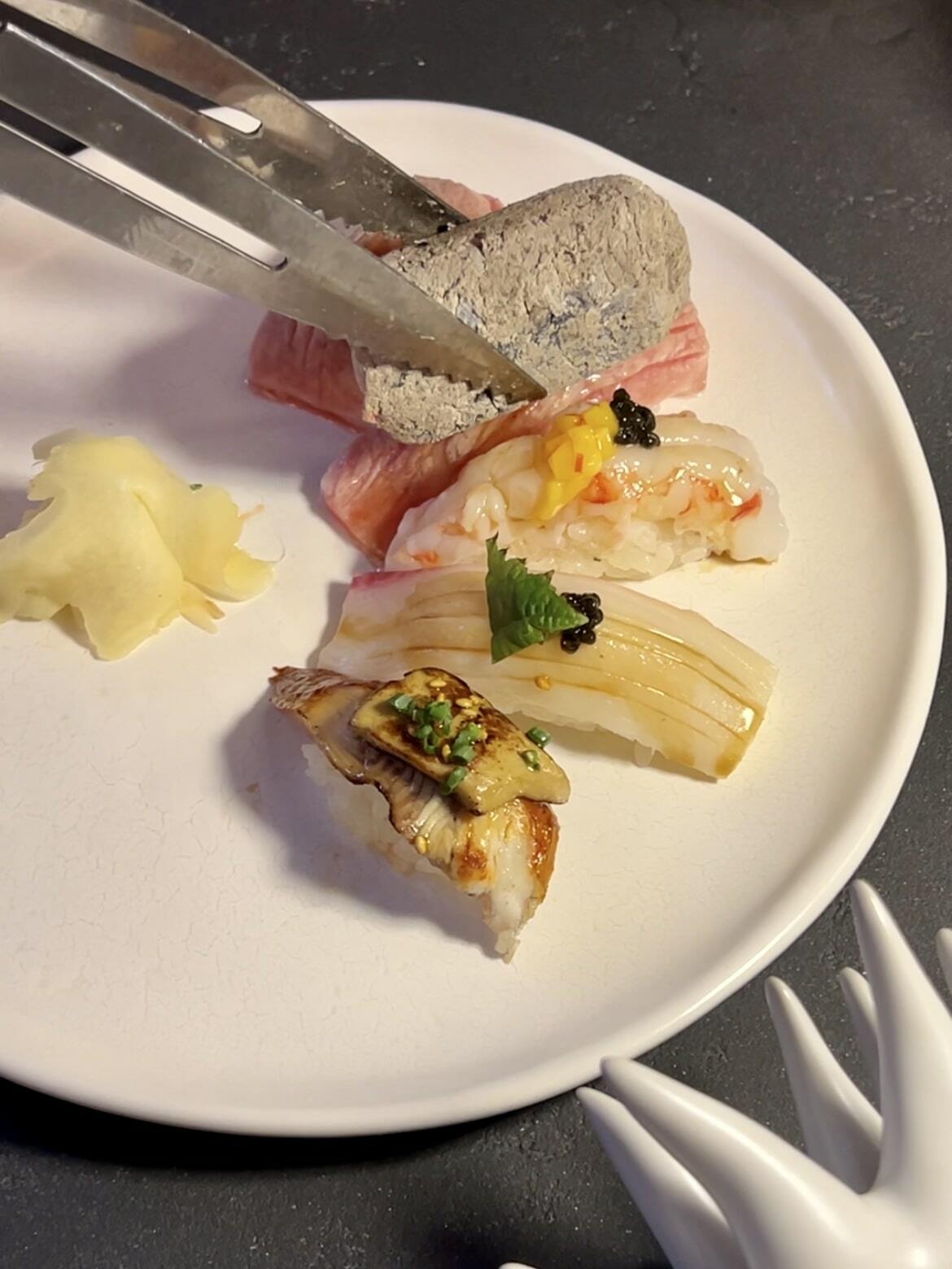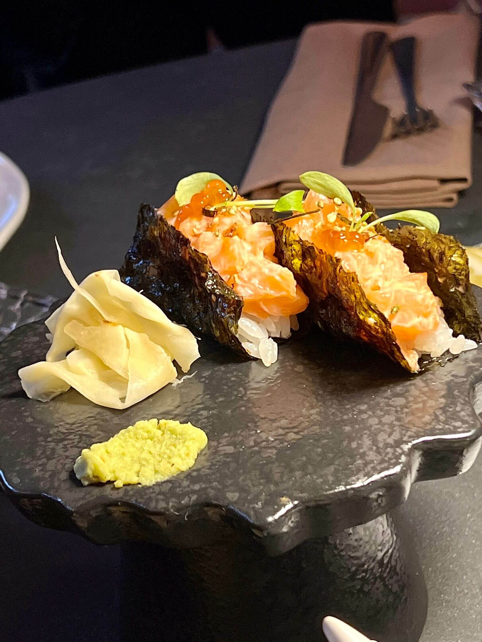 Суши с вагю опаляются прямо перед гостями, чтобы добавить «вау» эффекта подачи.