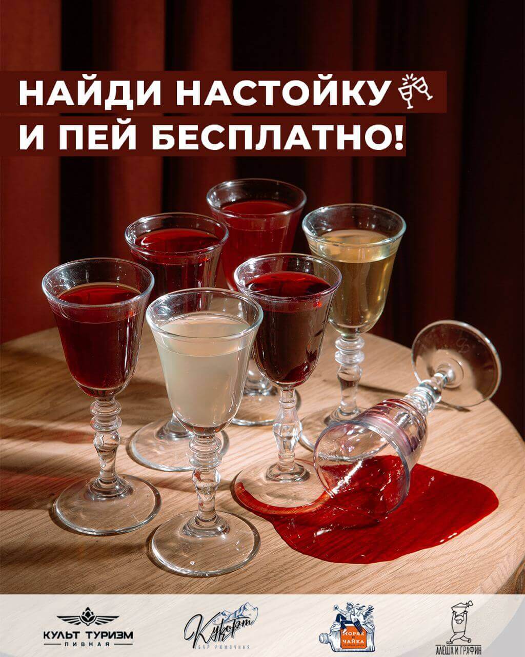 А еще вплоть до 7 апреля в 4 питейных заведениях на Новослободской проходит Фестиваль настоек (см. фото)! До 30 марта закажите любую настойку и получите отметку в «путевом» листе, чтобы потом пить настойки уже бесплатно! Отличная идея собрать друзей и устроить бар-хоппинг.