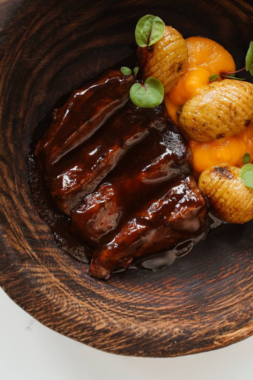 Рекомендуем попробовать: освежающий огуречный или томатный гаспачо с креветками или крабом, легкий салат с манго и спаржей, домашнюю пасту со страчателлой, говядину на гриле с морковным кремом и запеченным картофелем, лопатку ягненка на компанию или ягненка с шафраном и птитим из летнего меню. На десерт: медовый QLO и красивая панна-котта с клубнично-малиновым соусом.