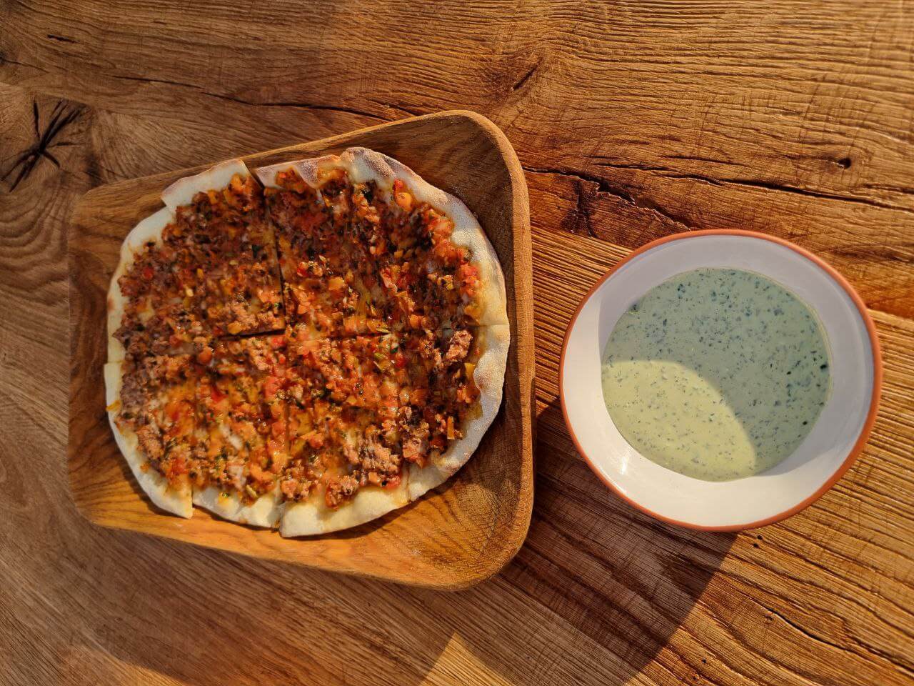 …При входе на веранду сложно не заметить большую печь, из которой искусные повара постоянно достают горячую выпечку. Как и многие другие гости, мы не смогли устоять против соблазна попробовать Лахмаджун с бараниной (590₽) и Пиде из сулугуни и свежей зелени (530₽).