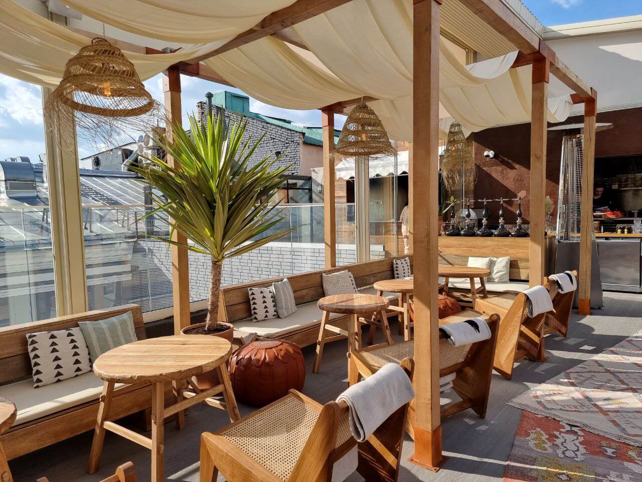 В оформлении пространства выдержана основная лаундж-стилистика — концепция низкой посадки. Столы и плетеные из ротанга кресла, ковры с типичными восточными орнаментами, кожаные пуфы, множество подушек. Исполинские кактусы в керамических горшках олицетворяют портал прямиком в пустыню. Особую воздушность и восточный шарм придают светлые тканевые шатры и плетеные абажуры.