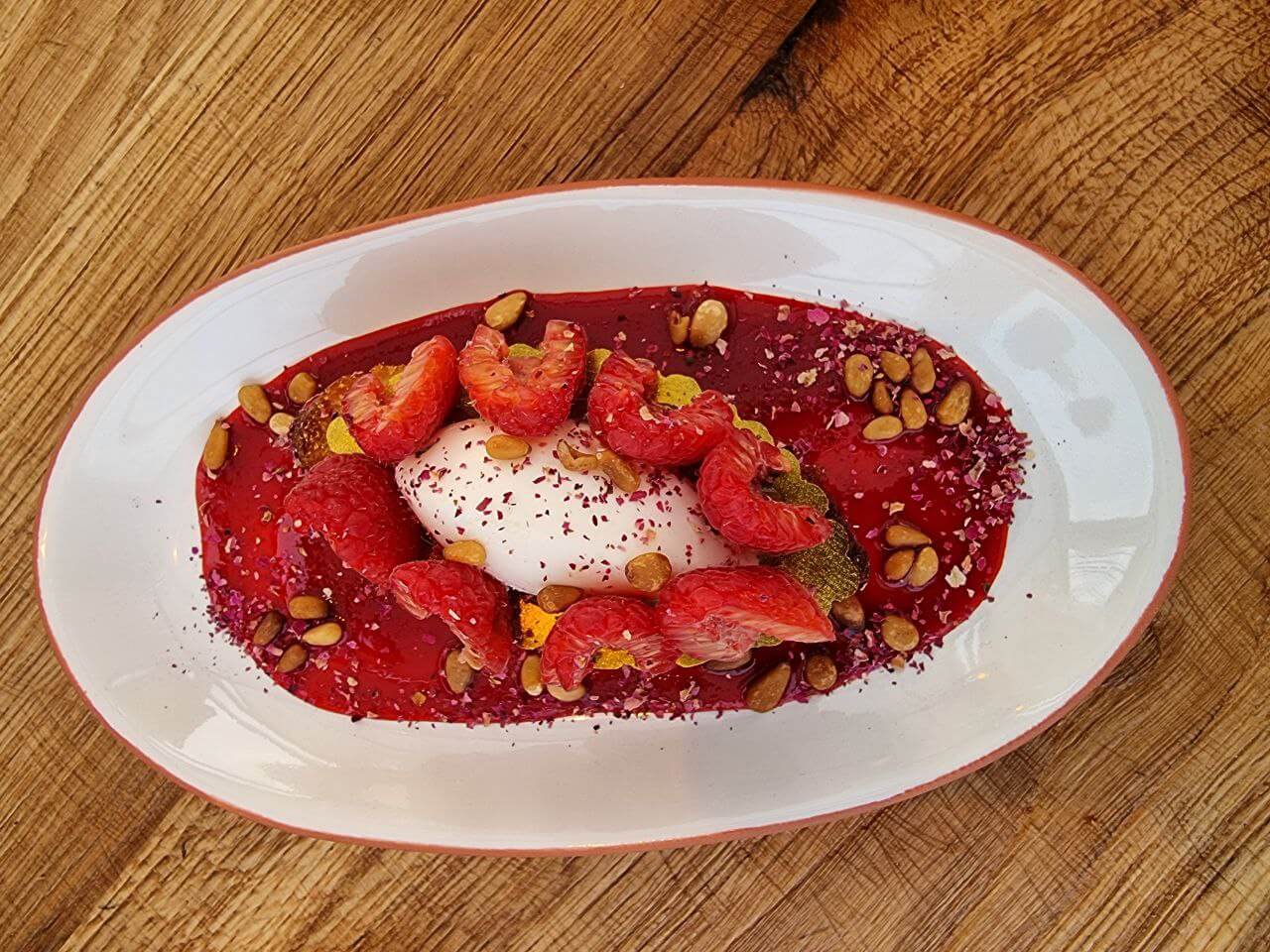 Манный кекс с розовой водой и малиной (750₽) проигрывает предыдущему «коллеге». Он имеет очень ярко выраженный вкус розовой воды, который слишком «возвышается» над остальными ингредиентами. Обещали этот момент проработать и сделать его более сбалансированным. Подается с кедровыми орешками и малиной.