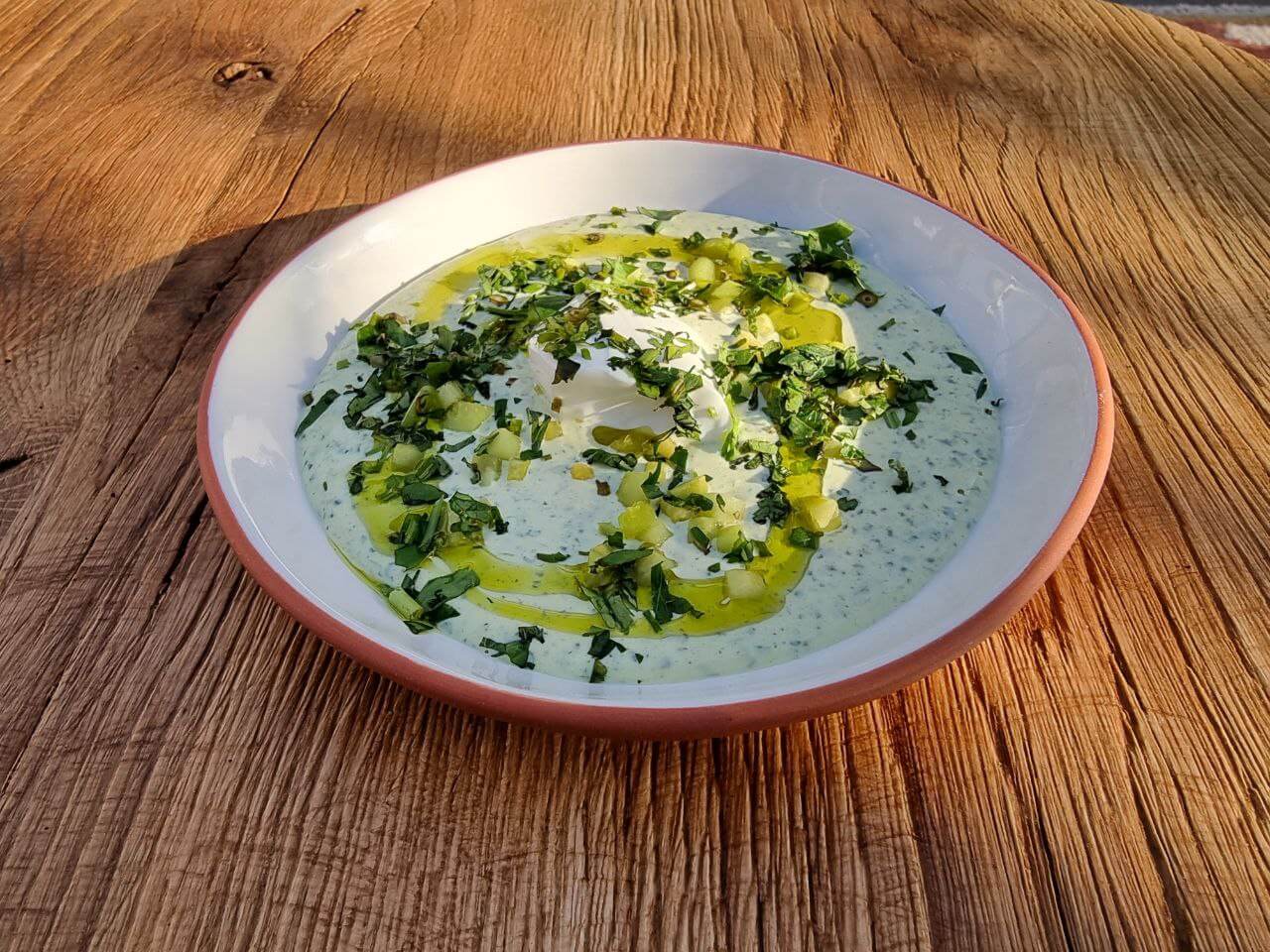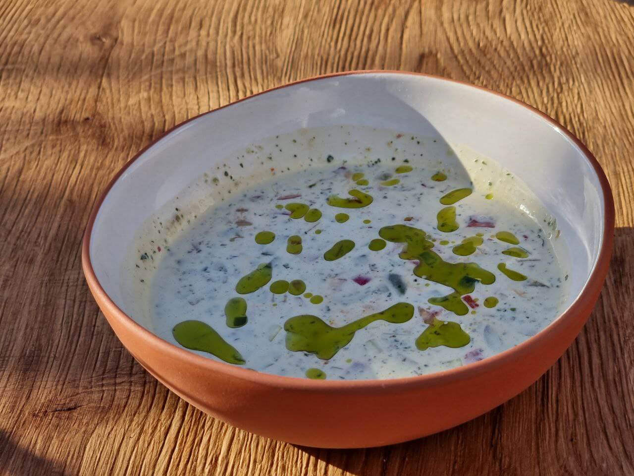 Холодный суп с мацони (420₽) хоть и отсылает нас в Грузию своим названием, идеально вписывается в концепцию заведения. Его иногда наши соотечественники называют «восточной окрошкой», но стоит отметить, что этот суп обладает гораздо более терпким вкусом с приятными острыми нотками. Идеален в жаркий день. Да и по вкусу он намного интереснее и многообразнее уже знакомой всем окрошки. Однозначная рекомендация!