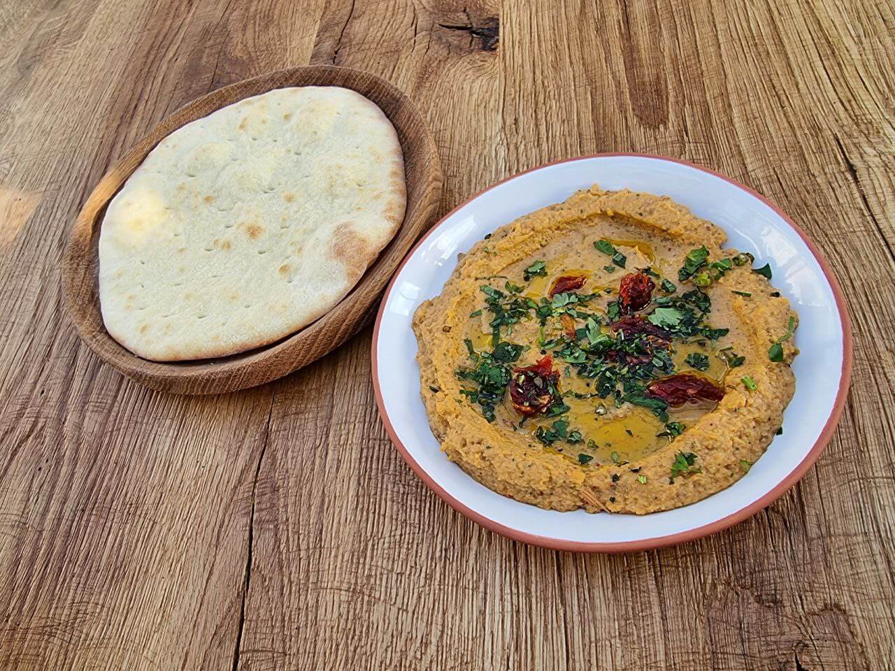 В лаконичном меню сплошь и рядом знакомые многим блюда родом из Сирии, Египта, Ливана, Марокко, Турции и Израиля. Следуя восточной традиции, мы начали знакомство с местной кухней с Хумуса с вялеными томатами (550₽), который подается на стол в комплекте с горячей лепешкой катмер. Блюдо одновременно имеет хорошую плотность и нежную кремовую текстуру, что весьма необычно для «хумуса по-московски». Отличное оливковое масло, правильный микс специй и зелени делают из нутовой пасты отличное полноценное блюдо. И пожалуйста, ешьте хумус как это делают на Востоке, взяв кусочек питы и макая в пасту, никакие приборы здесь не нужны!