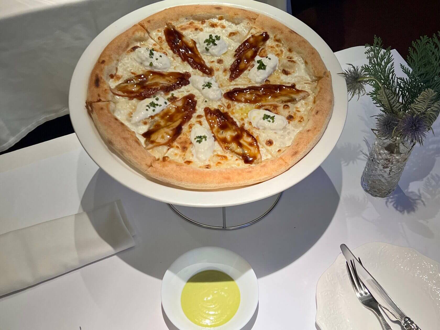 Чуть правее на кухне пекут хлеб и раскатывают итальянскую пиццу. Тем, кто не любит тесто или не переносит глютен, приготовлено спасение — основу для пиццы могут приготовить из миндаля и цветной капусты. Надо доплатить только 300 рублей и выбрать начинку: от бурраты с трюфелем до пастрами с халапеньо. Мы рекомендуем попробовать угорь со страччателой — абсолютный хит: сытная, сочная, гармоничная, хоть и далекая от классики.