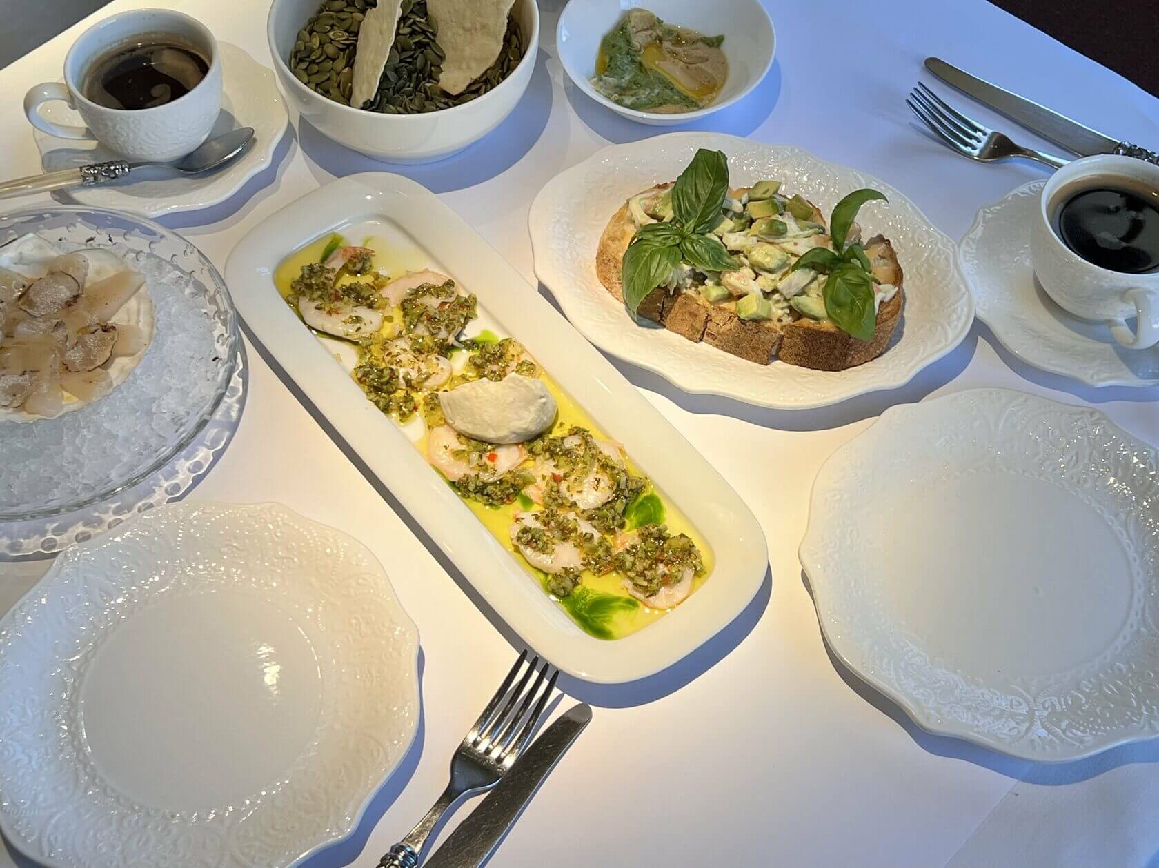 слева - карпаччо из гребешка, в центре - креветки с хумусом, справа - брускетта с крабом и авокадо
