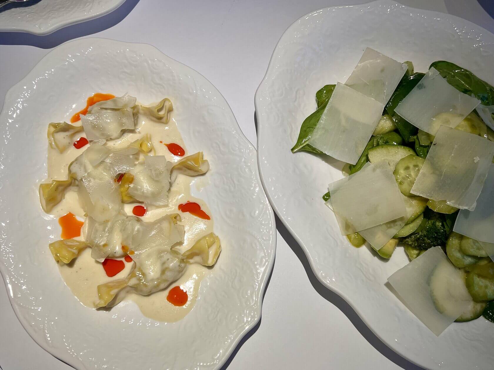 слева - равиоли с ягнёнком и сыром раклет, справа - зеленый салат Loona