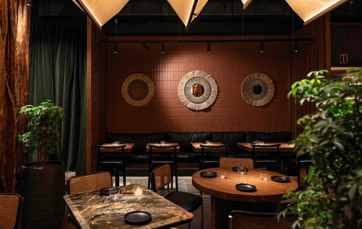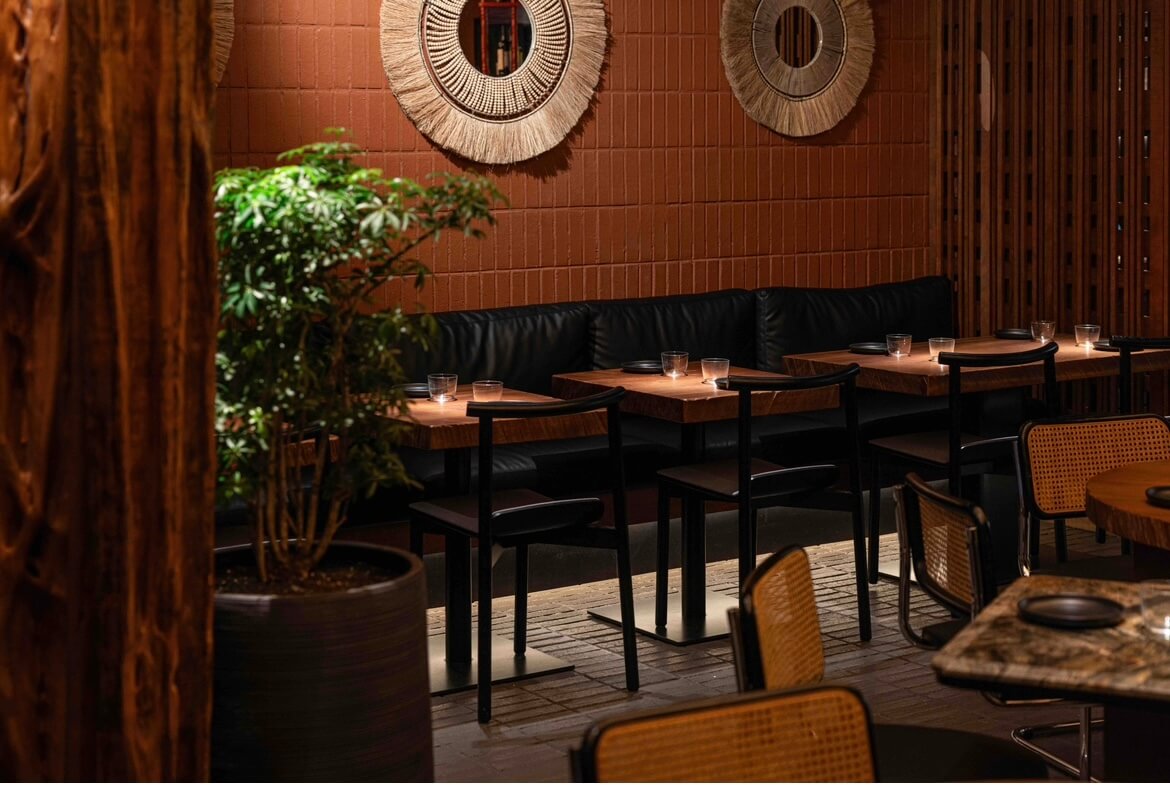 Внутри обилие зелени под мягким, теплым светом. Занятно, что в качестве светильников использованы антикварные азиатские варианты ланч-бокса, а по обе стороны зала «выросли» настоящие деревья капанаубра. Экзотические растения привезли сюда из Бразилии, а на местных рынках в Банкгкоке собрали всю посуду.