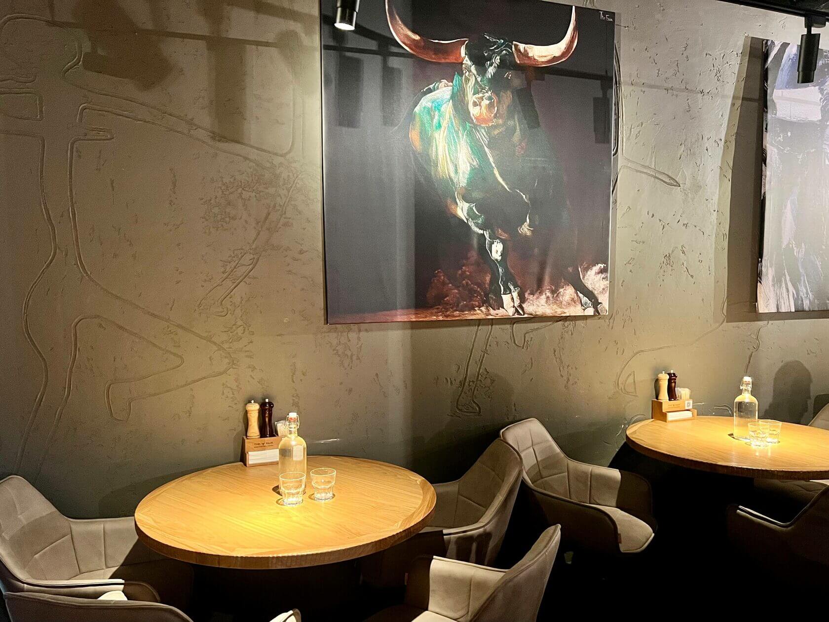 Оглядевшись по сторонам, пока вам несут заказ (а это 15−20 минут), можно заметить, что интерьер отвечает всем ресторанным критериям. Приглушённый свет в зале, неоновые вставки в виде морды бычка и много зелени.