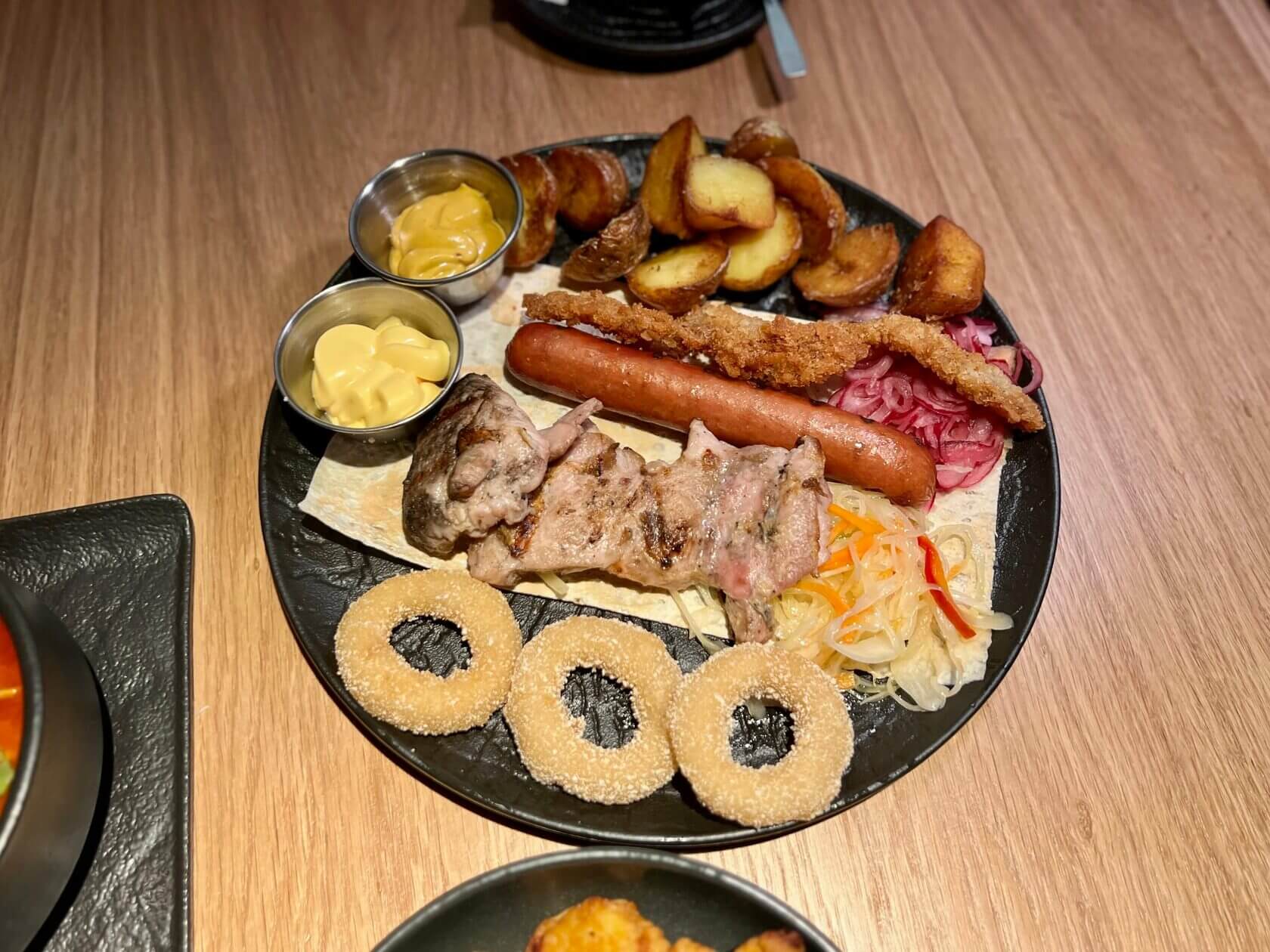 По будням до 17:00 можно заказать огромную тарелку (600г) с шашлыком, луковыми кольцами, сосиской, стрипсами, салатом и двумя соусами. Большое, сочное предложение, которым не жалко поделиться с другом.
