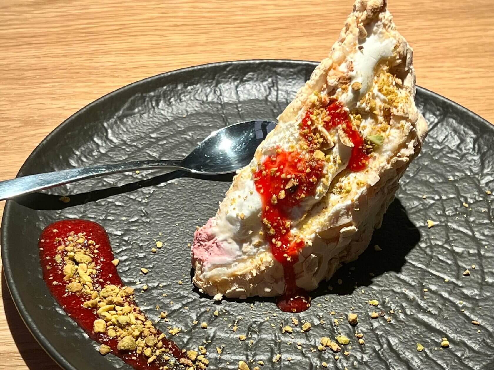 В разделе десертов встречают классикой: чизкейк, фондан, медовик и фисташковый рулет. Заказанный «Фисташковый рулет» оказался не совсем тем, за кого себя выдаёт: без хрустящей основы, с лёгким кремом внутри, больше походящим на тёплое мороженое, чем на классический сырный крем, к которому мы прикипели всей десертной душой. Но без сомнения, нежный десерт, который точно оценят девушки.