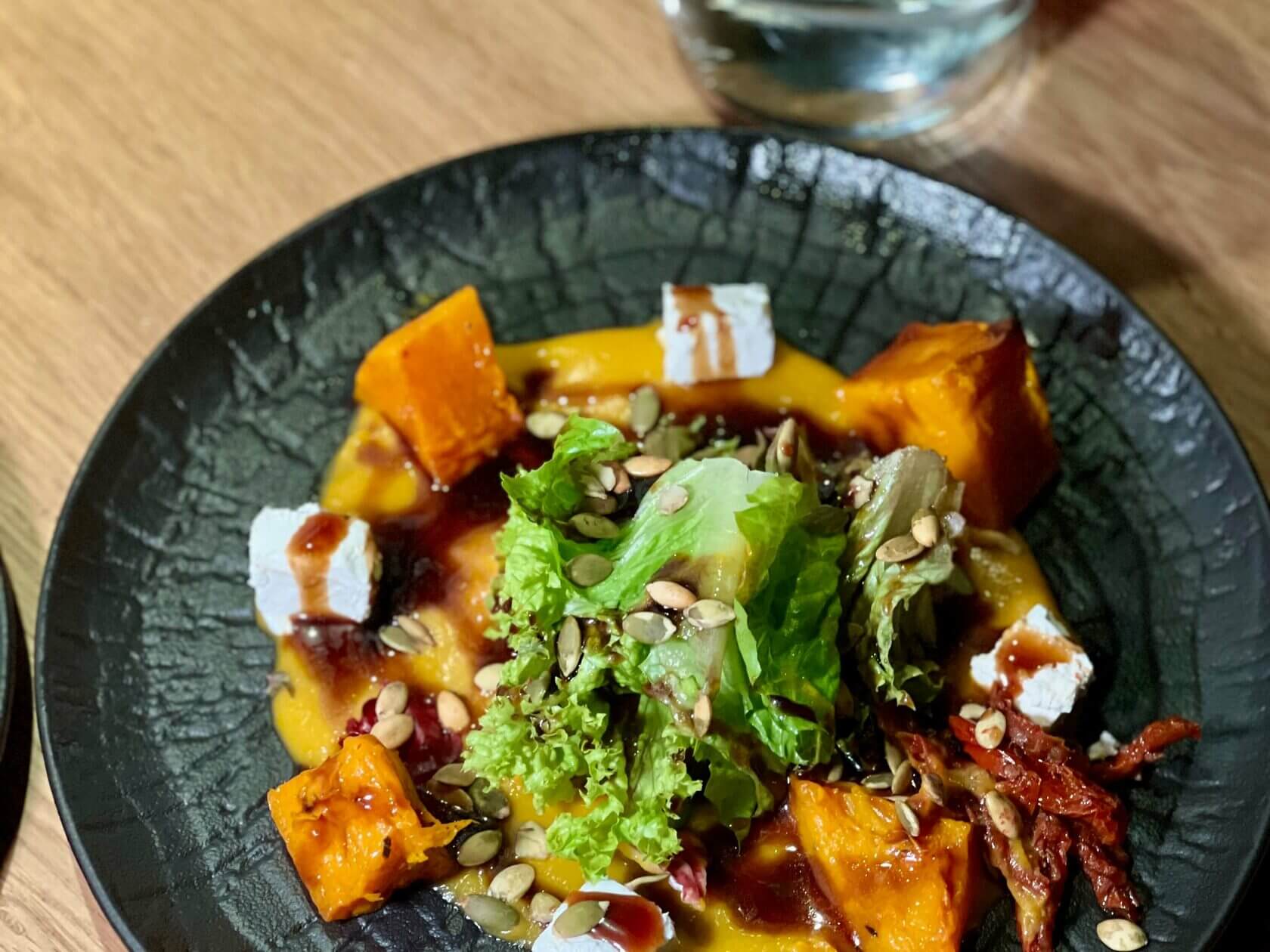 В разделе салатов больше десяти позиций. В каждой порции минимум 200 грамм с обилием зелени. «Салат с печёной тыквой и фетой» порадовал балансом текстур и нежным сыром.