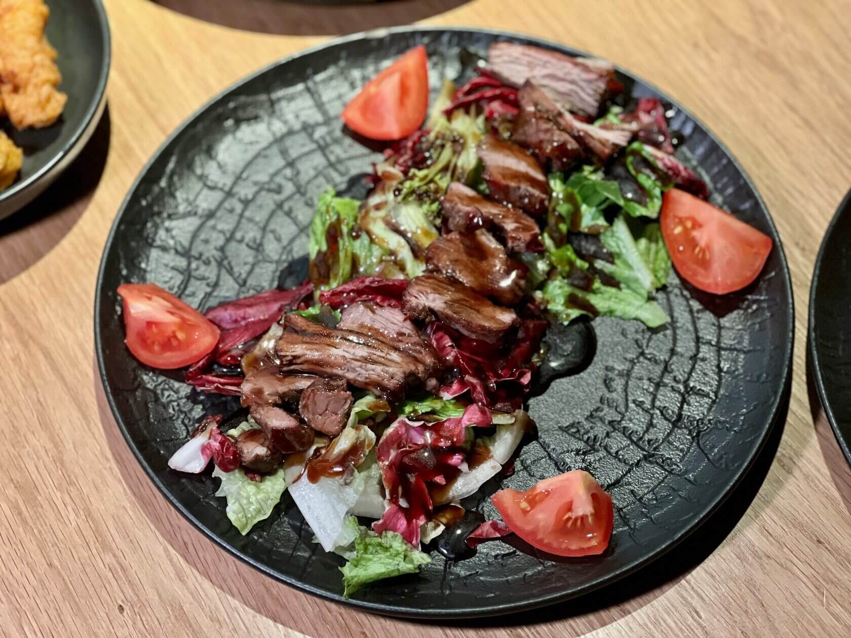 Артиллерия чуть потяжелее, но все ещё в разделе салатов - “стейк салат с говяжьей вырезкой и томатами”. Классическое, понятное сочетание под заправкой крем-бальзамик.