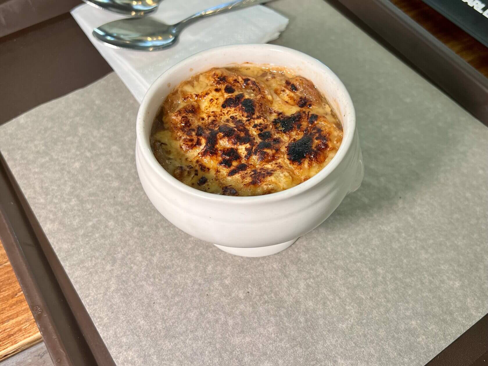 По семейному рецепту Акселя Нажи в корнере готовят и луковый суп. Наваристый бульон и прозрачный состав: только лук, коньяк, белое вино, специи, а сверху чесночные крутоны и сыр маасдам. И хоть в отзывах посетителей (на картах) блюдо имеет спорную репутацию: одни настойчиво хвалят, другие бескомпромиссно ругают, наша редакция смело рекомендует к заказу сладковатый, густой и насыщенный суп. Сырная шапка не слипается и не сбивается в резиновые комки.