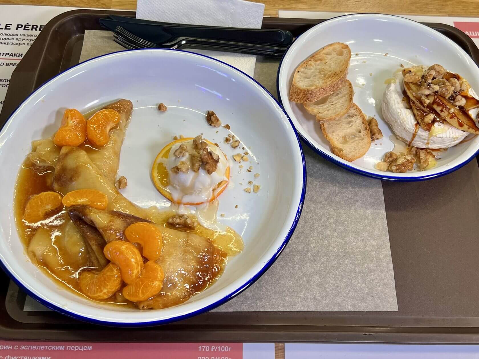 слева «креп сюзетт» — специальное предложение к масленичной неделе, справа - запеченный камамбер с грецким орехом и грушевым кони из основного меню