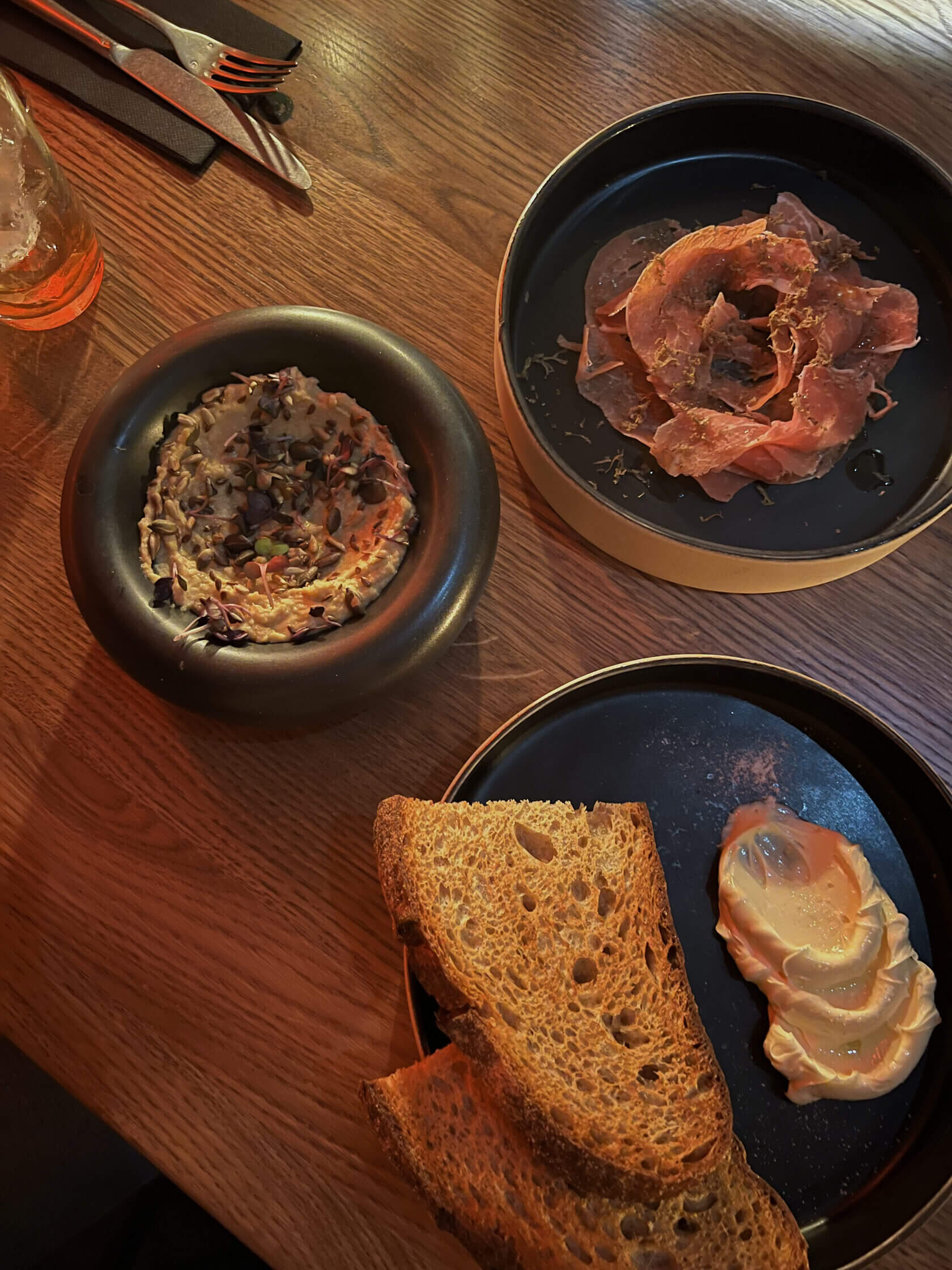 Хумус из артишока 250 рублей, трюфельное прошутто 700 рублей, хлеб с маслом 250 рублей.
