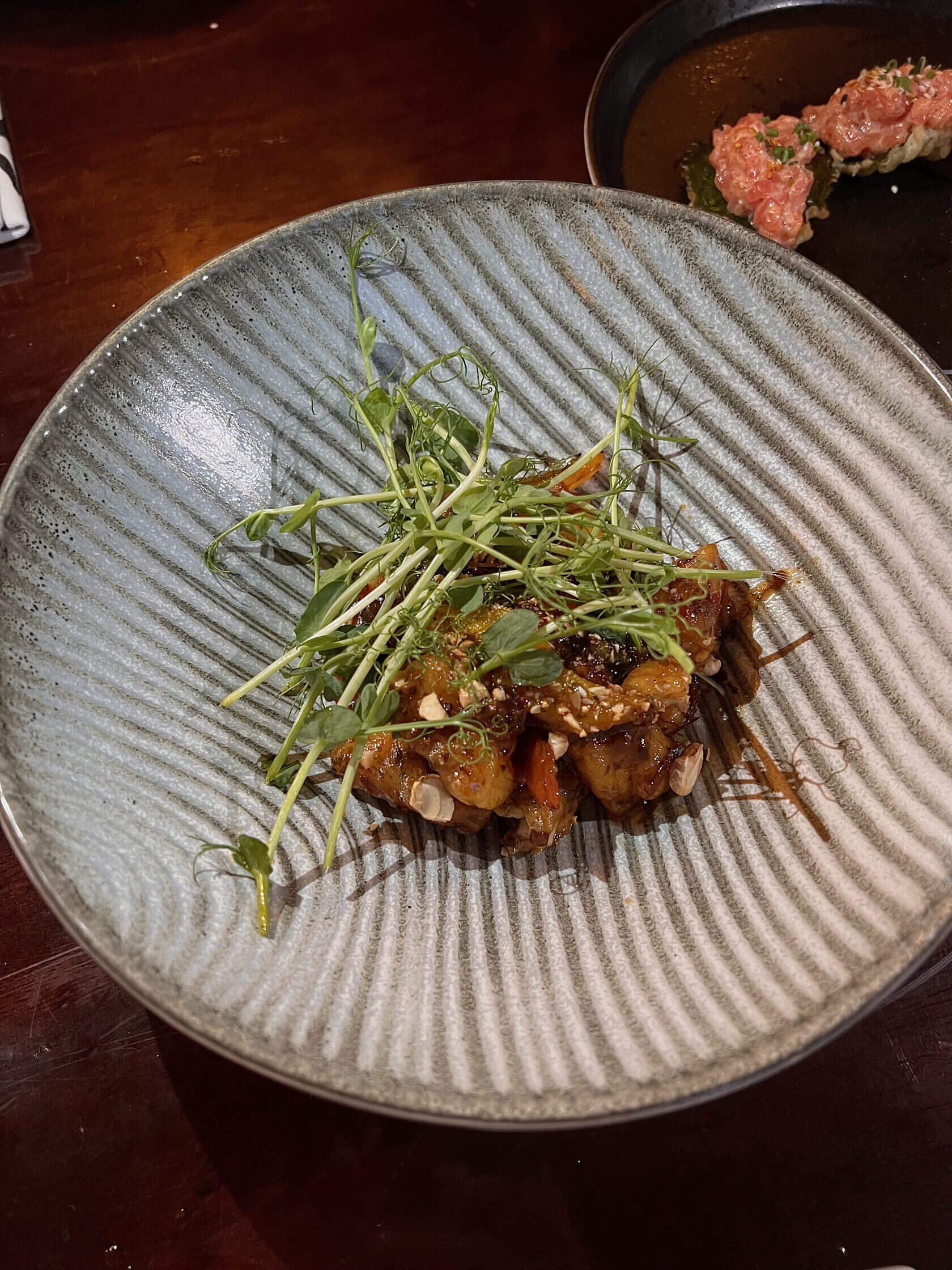 Редакция попробовала всё и определено рекомендует обратить своё внимание на судака с кешью (890₽). Нежный, хрустящий кафтан на рыбе в тёплом обрамлении китайского соуса с щедрой порцией микрозелени гороха впечатляет. Даже удивительно, что судак так умеет.