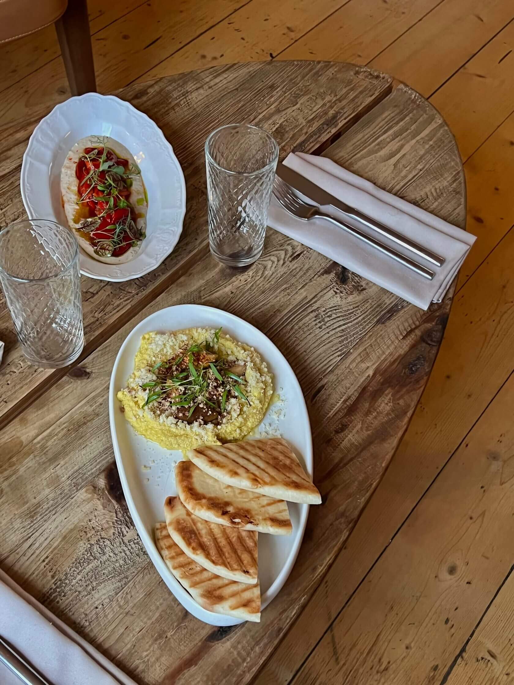 Эксперименты продолжили в разделе закусок. Любителям рыбы посвятили перец рамиро с соусом из тунца (490₽). А для тех, кто не умеет выбирать между сладким и хумусом приготовили хумус с карамелизированной грушей, миндалем и пармезаном (590 ₽). Сладкая в меру груша скорее ненавязчиво заигрывает с карамелью, чем обещает на ней жениться. Обязательно пробуйте.
