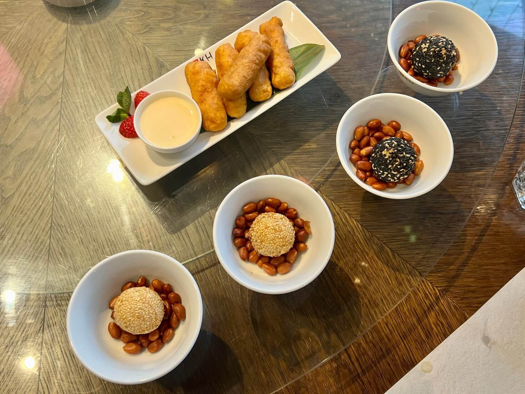 Вверху - жареное молоко, внизу - китайские пончики: белые с арахисом, чёрные с фасолью