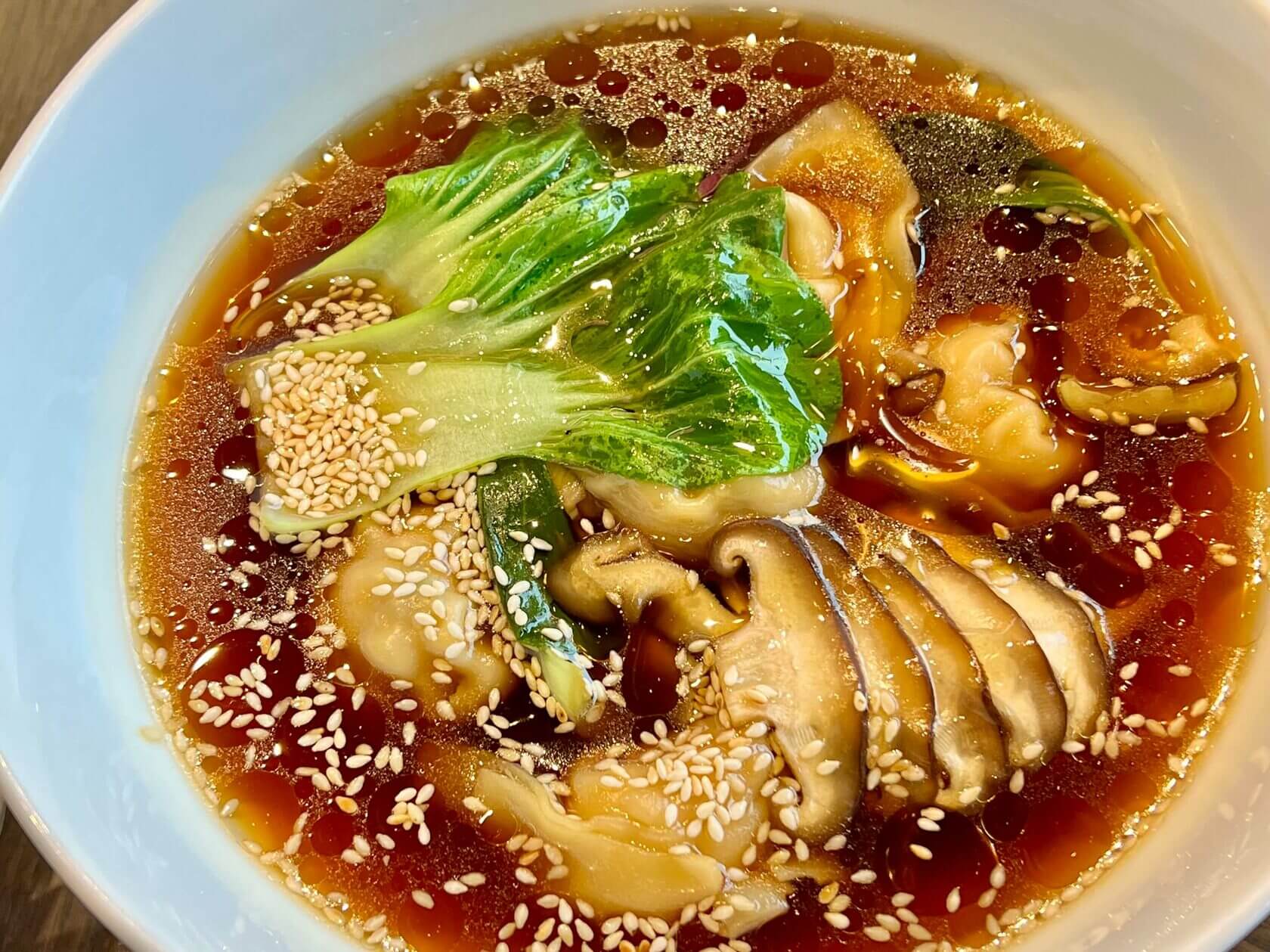 Похлёбка не слишком острая, вмещает в себя шампиньоны, шиитаке, чёрные древесные грибы, и больше подходит для легкого обеденного «разогрева», вонтон уже посытнее, с насыщенным рыбным вкусом. И чего уж там, отлично сойдёт за «похмельный суп».
