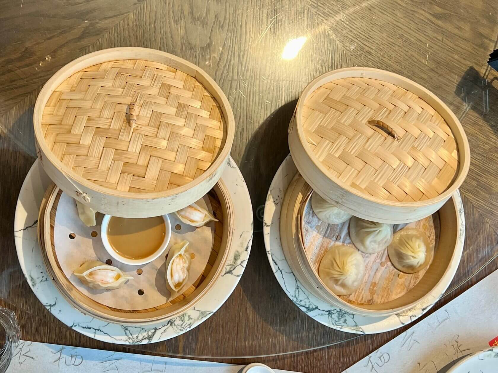 Слева - дим-самы шаомай, справа - пельмени «сяолунбао»