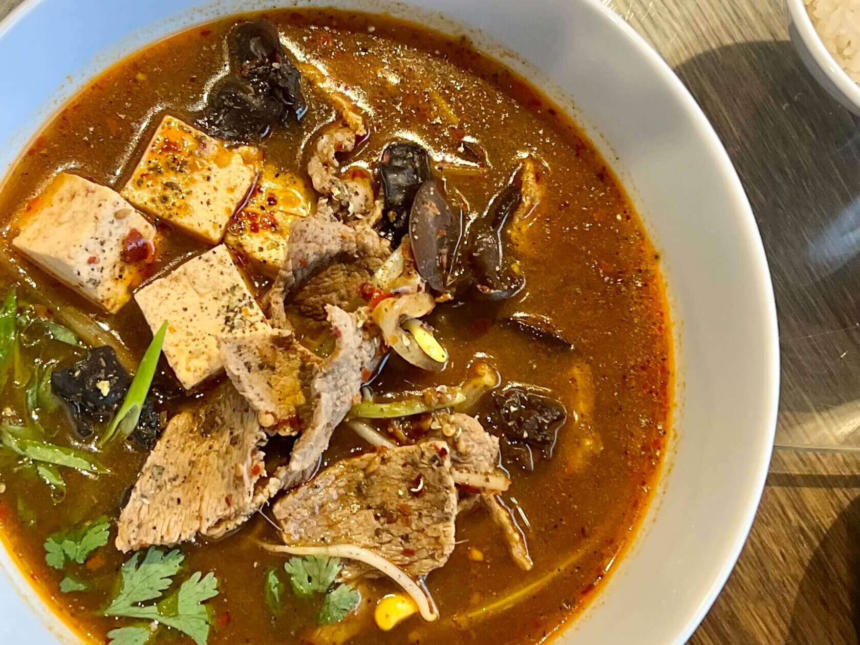 Добавить к списку горячих блюд стоит и лепестки говядины в остром сычуаньском соусе (1190₽): тофу, лук, зелень, лапша и тонкая говядина в пряно-сладковатом обрамлении.