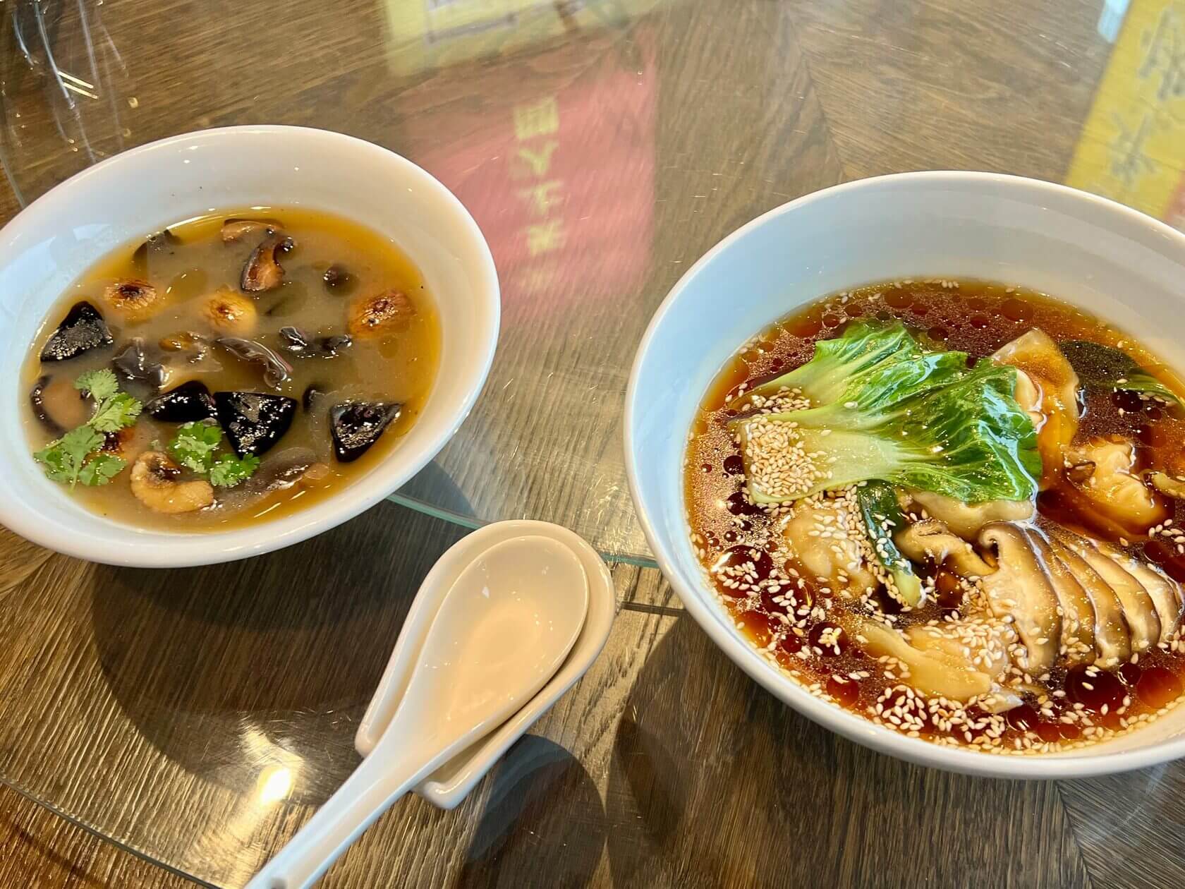 Слева - грибная похлёбка, справа - суп вонтон с лососем