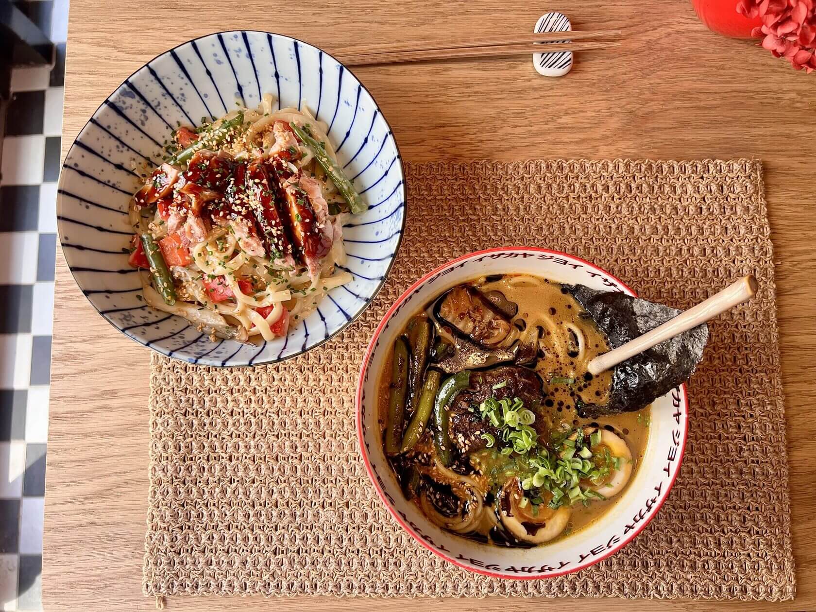 Сёю рамен с говядиной и кимчи (830₽) и лапша с курицей в сливочном терияки (670₽)