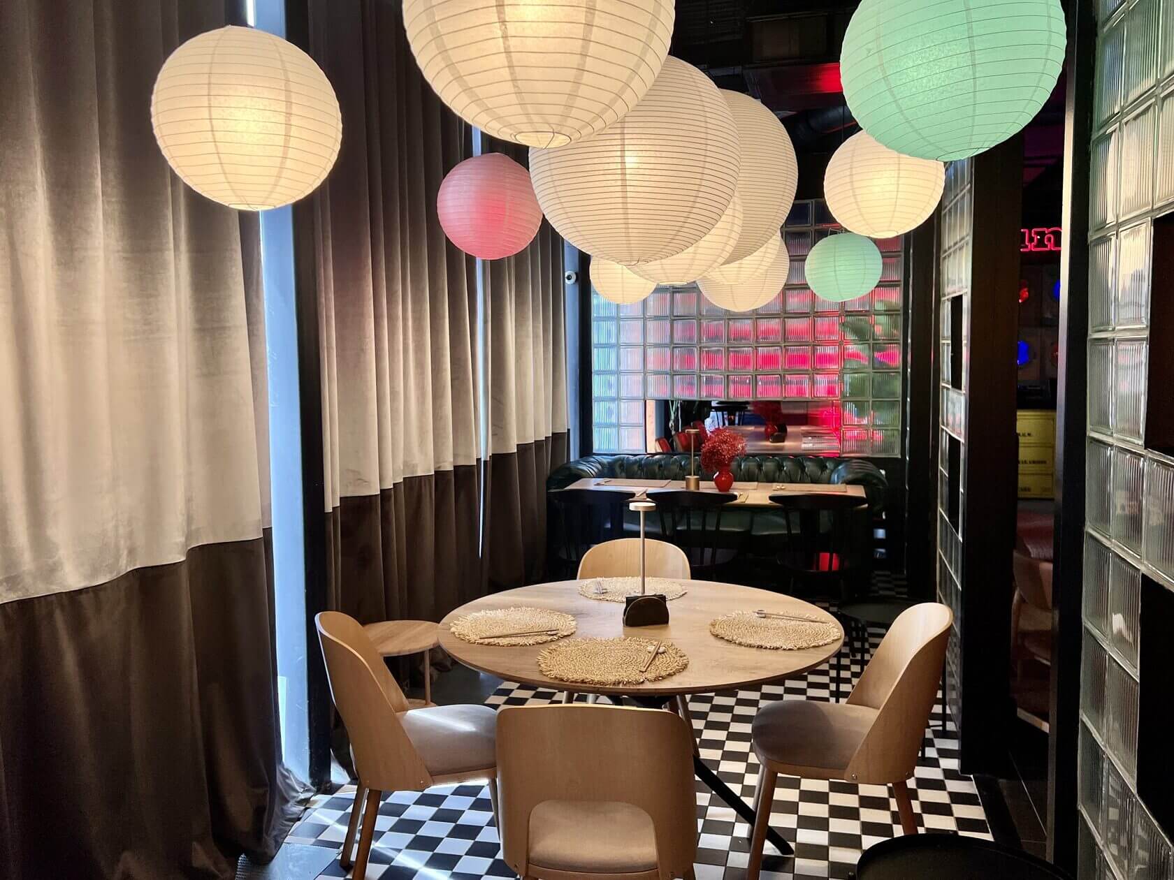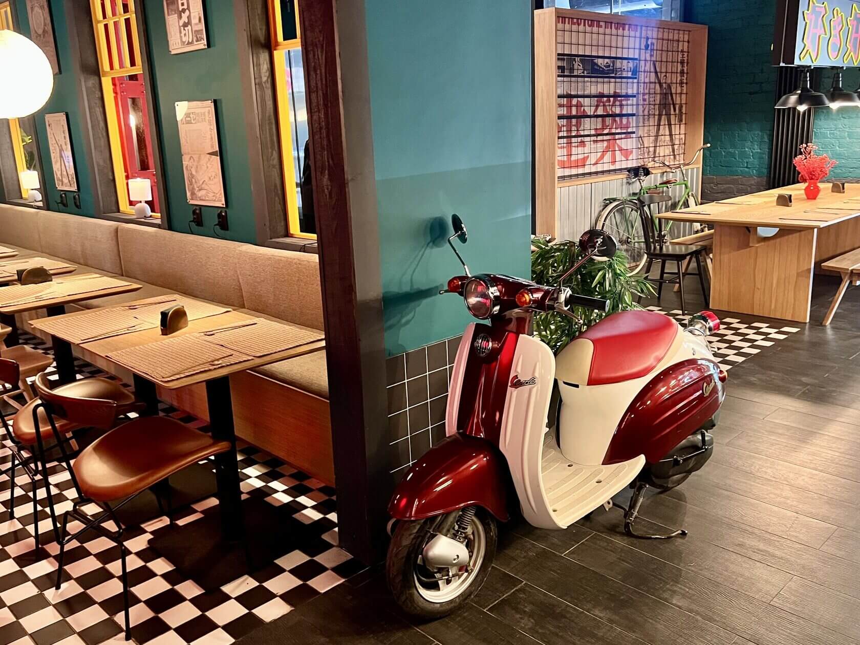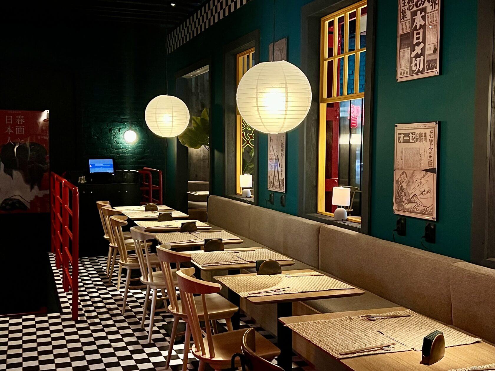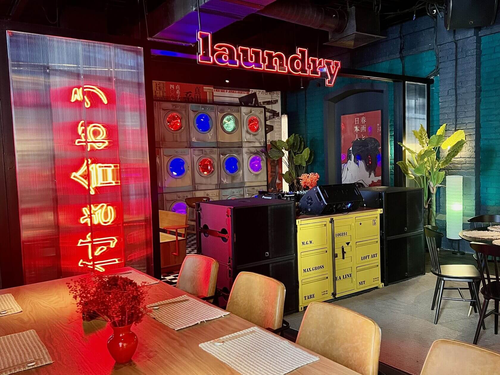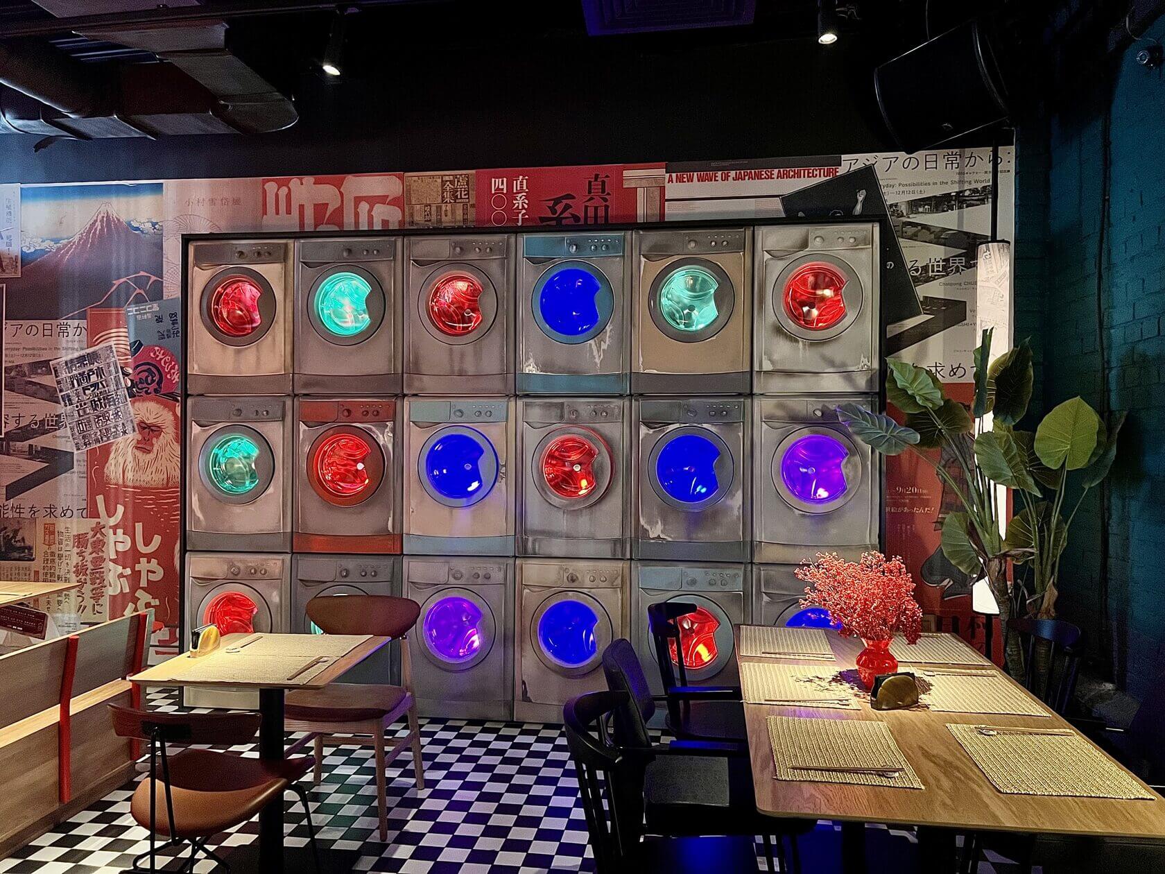 В японском ресторане на Белорусской припаркованы велосипеды и мотоциклы, горят неоновые вывески, развешены провода, а в центре зала, будто наблюдая за всем в 16 ярких глаз, расположилась старая прачечная.