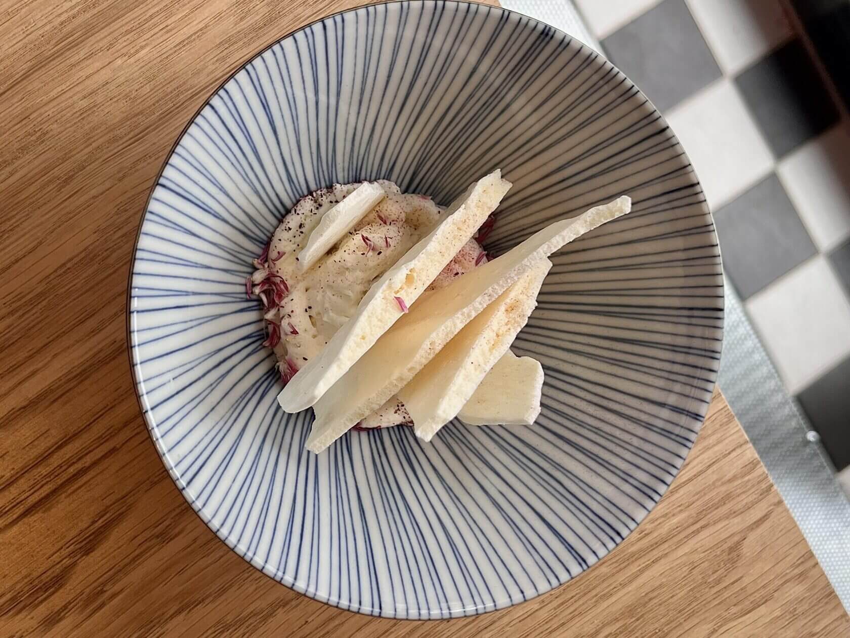А перестроить овощной маршрут в сторону десерта можно с помощью шисо Павлова (450₽) — немного слайсов лимонной меренги на крепко уложенном креме.