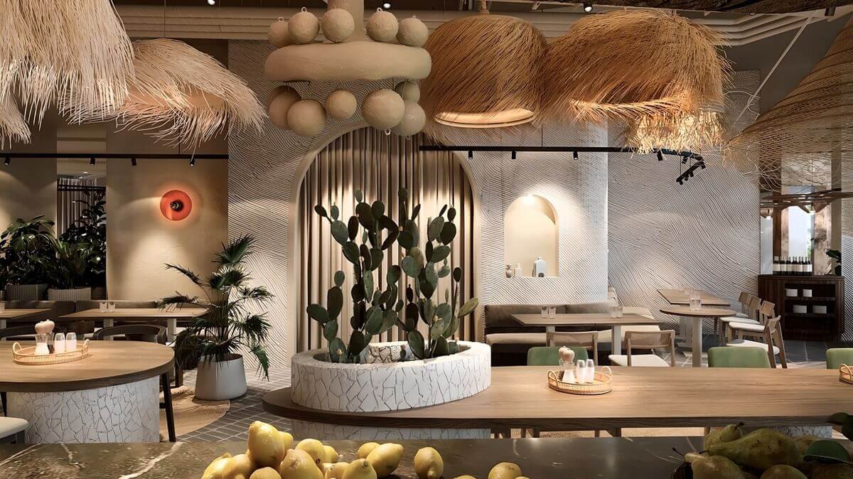 Соломенные абажуры, деревянные ширмы и барные стулья, каменная кладка стен, светильники, напоминающие солнце, глиняные украшения, полки с кувшинами и, конечно, большие ветвящиеся кактусы — все эти национальные акценты добавляют колорита и уюта для посетителей.